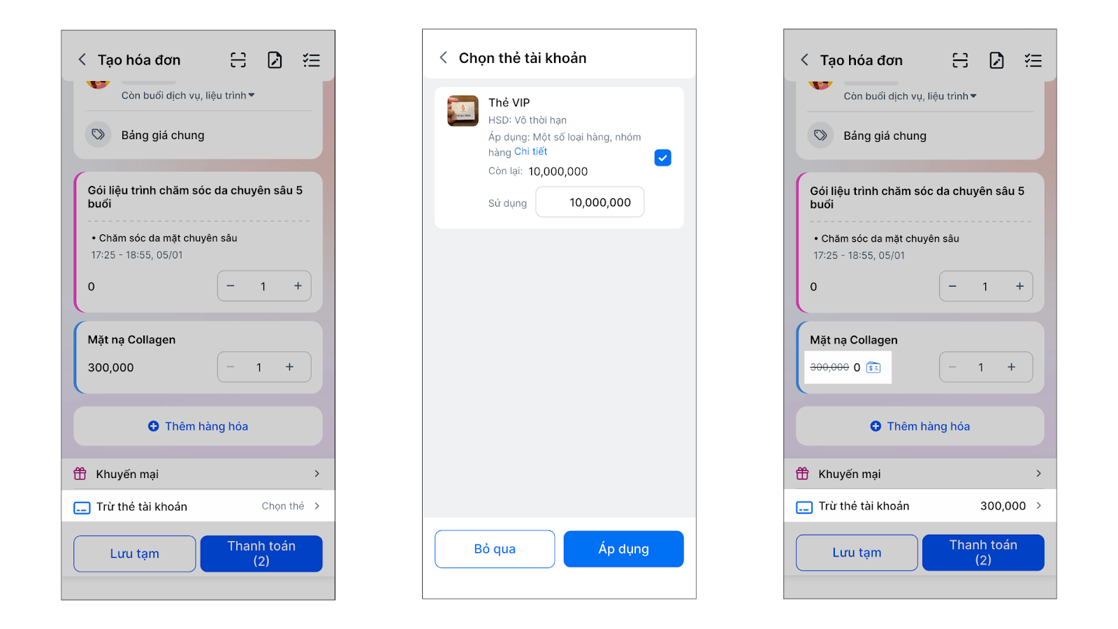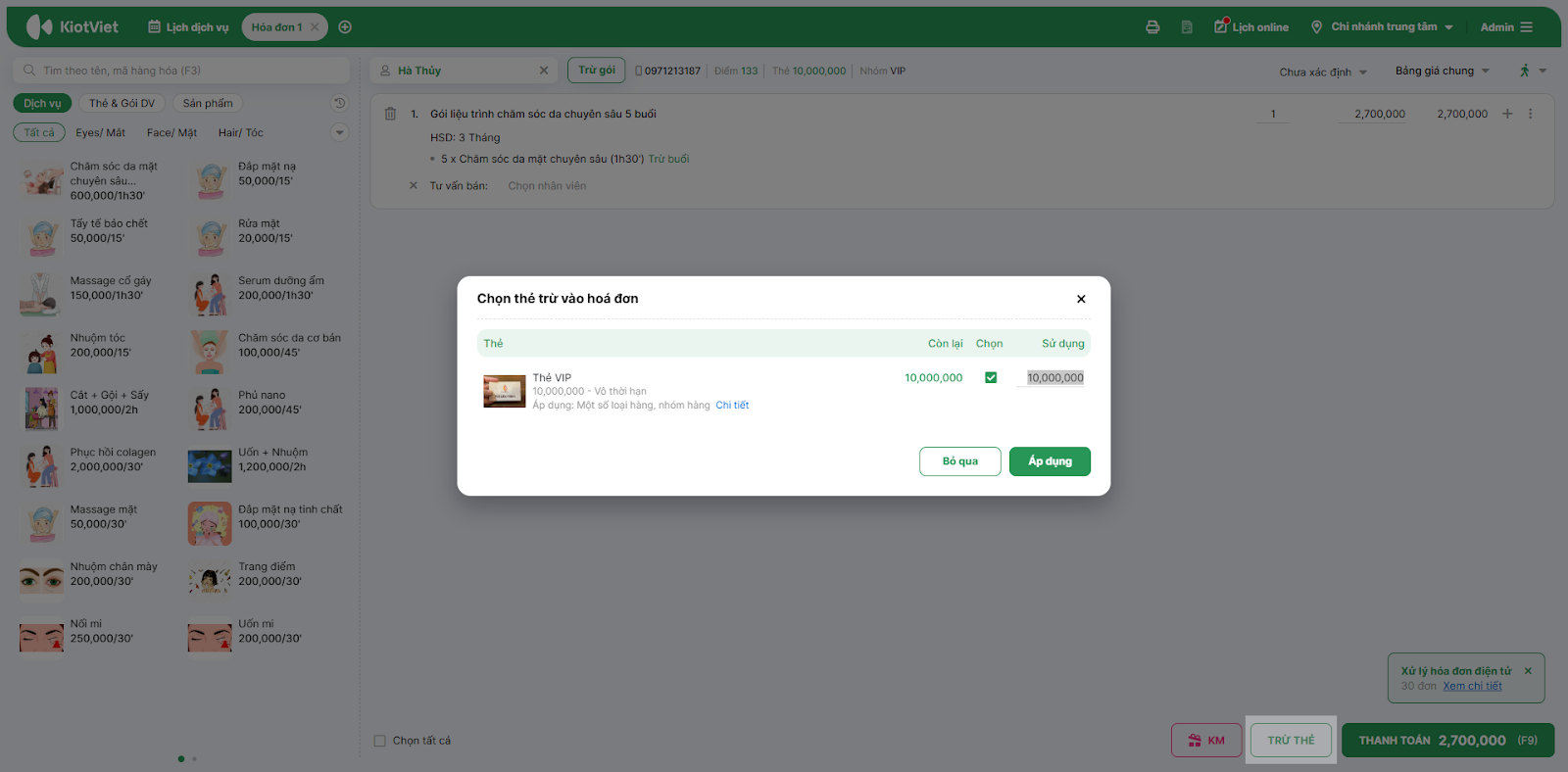 - Nếu khách dùng Thẻ tài khoản: Tại màn hình Tạo hóa đơn → chọn Trừ thẻ tài khoản → tích chọn thẻ và nhập số tiền Sử dụng (Hệ thống mặc định trừ hết giá trị đơn hàng hoặc tối đa số dư thẻ) → nhấn Áp dụng.