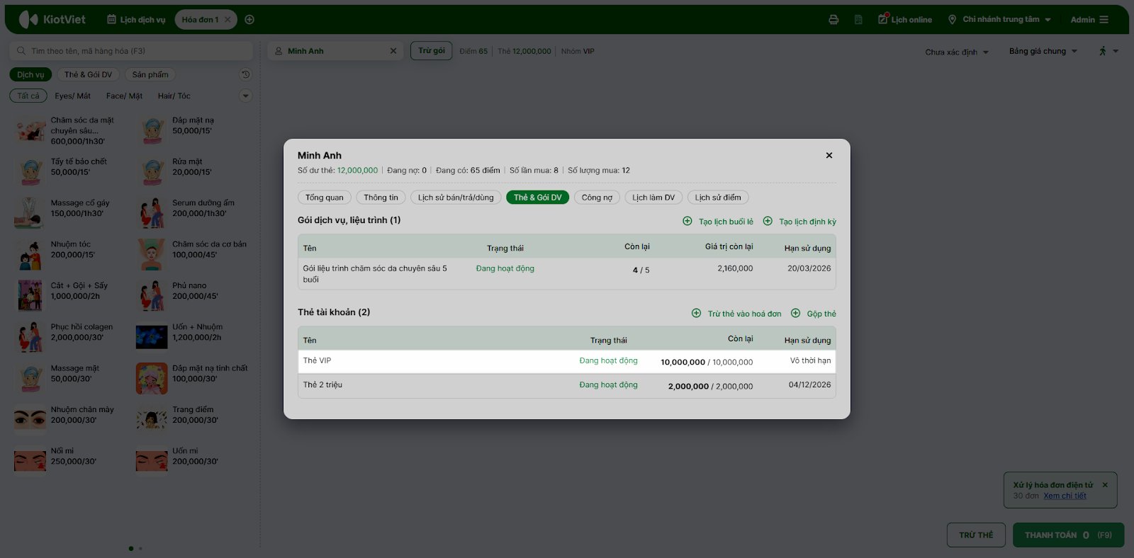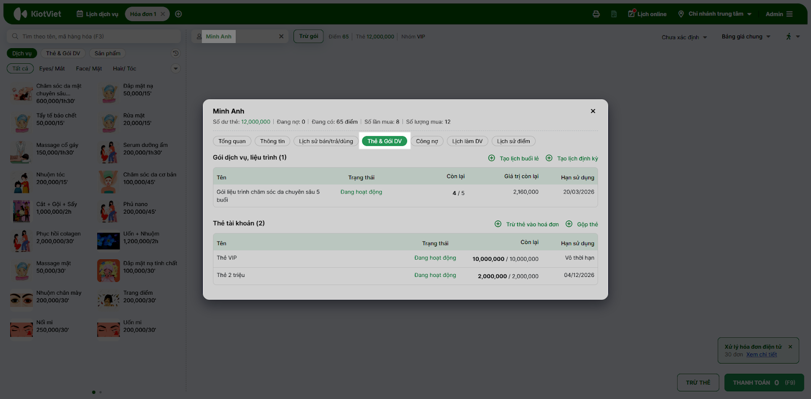 - Trên màn hình Thu ngân → nhấn vào tên khách hàng → chọn Thẻ & Gói DV.