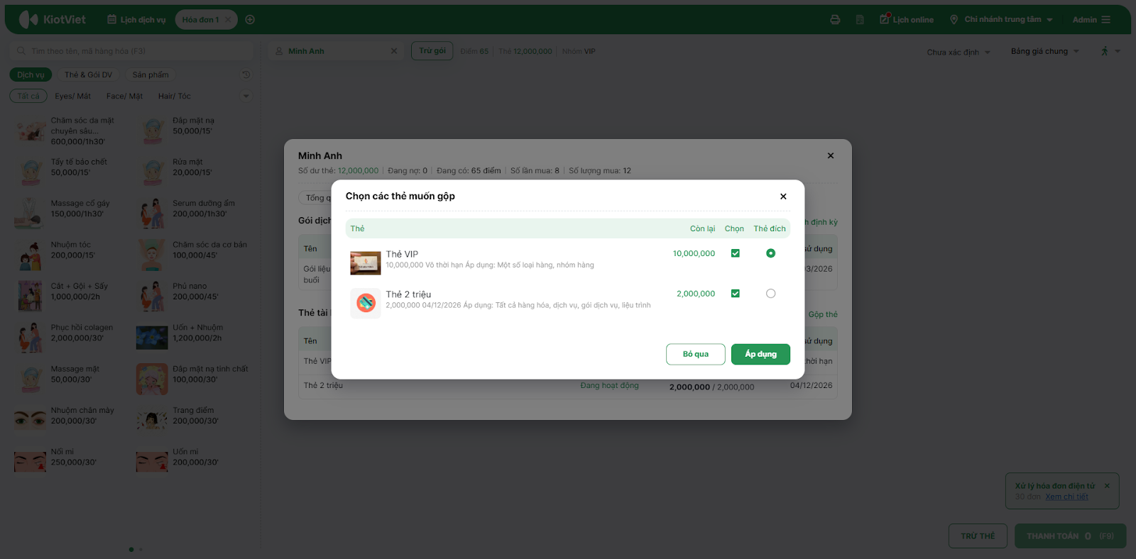 - Tích chọn các thẻ cần gộp → chọn thẻ đích → nhấn Áp dụng. (Thẻ cũ sẽ về 0, thẻ đích tăng giá trị tương ứng).