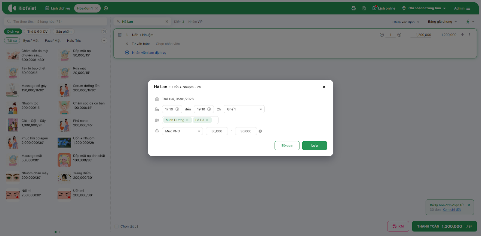 - Tình huống: Dịch vụ “Uốn nhuộm” giá 1,200,000đ do thợ Minh Dương (làm chính) và thợ Lê Hà (phụ) thực hiện. Bạn cần chia hoa hồng ngay trên hóa đơn.