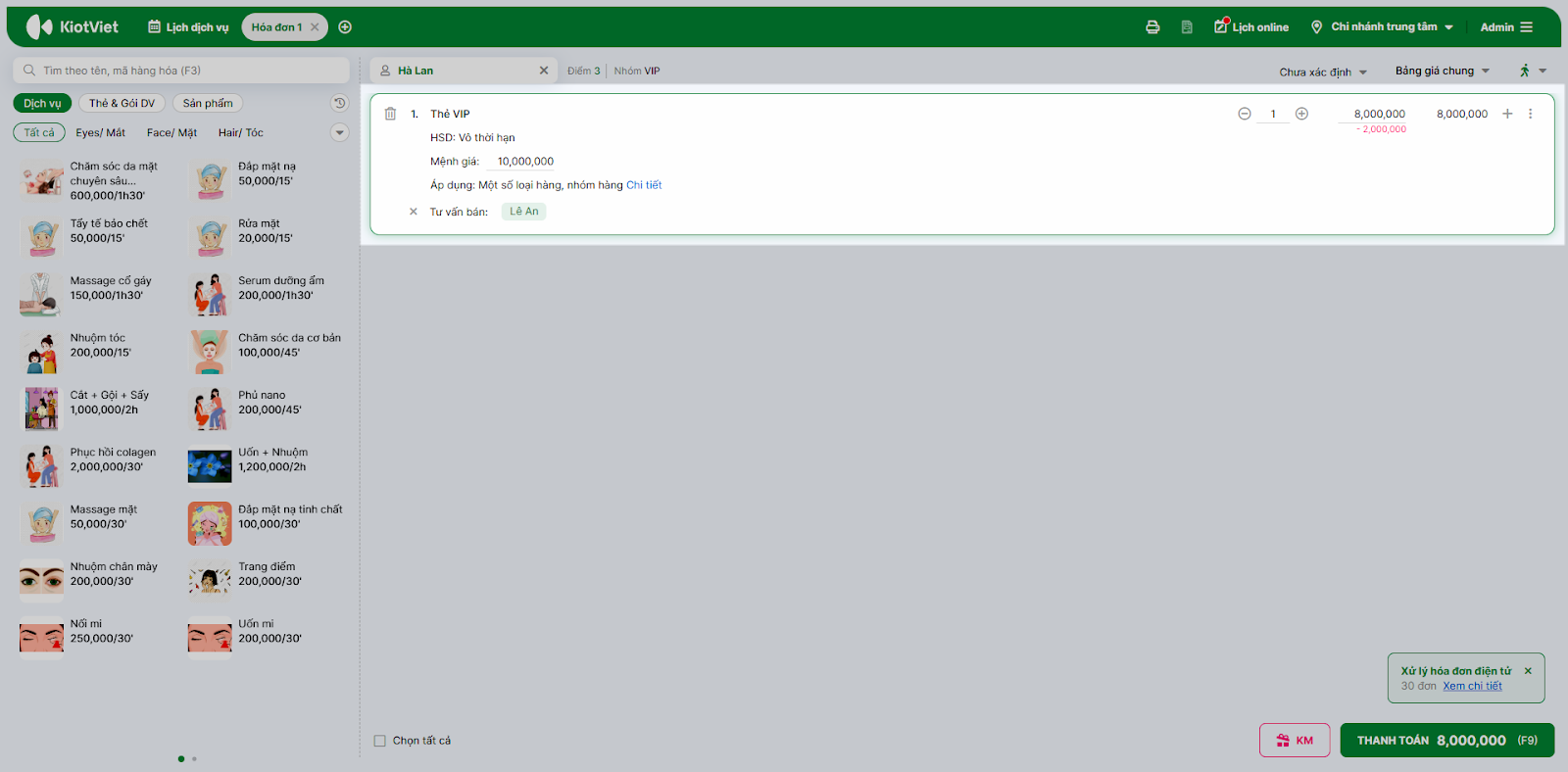 - Chọn khách hàng → chọn hàng hóa “Thẻ VIP”.