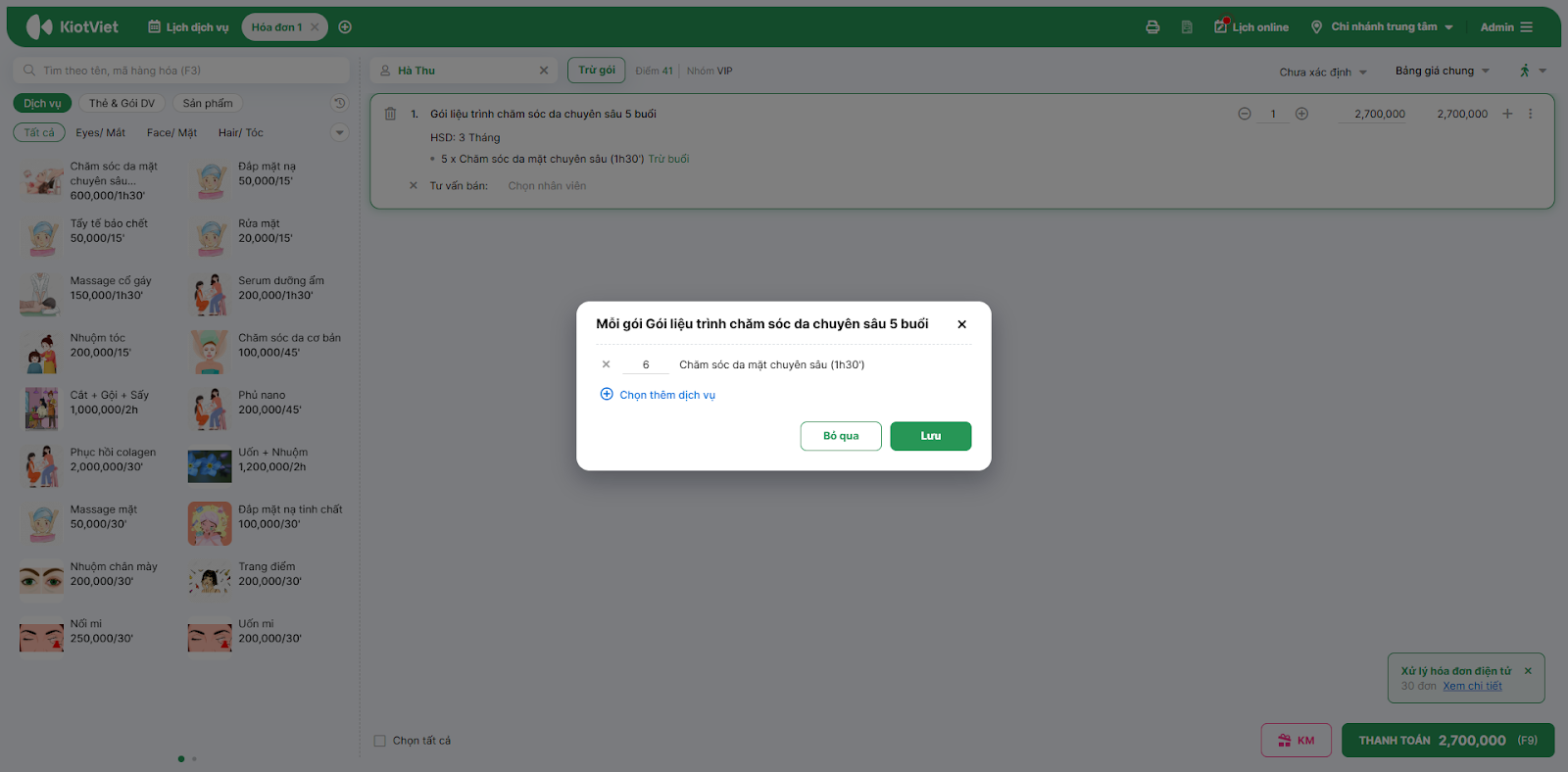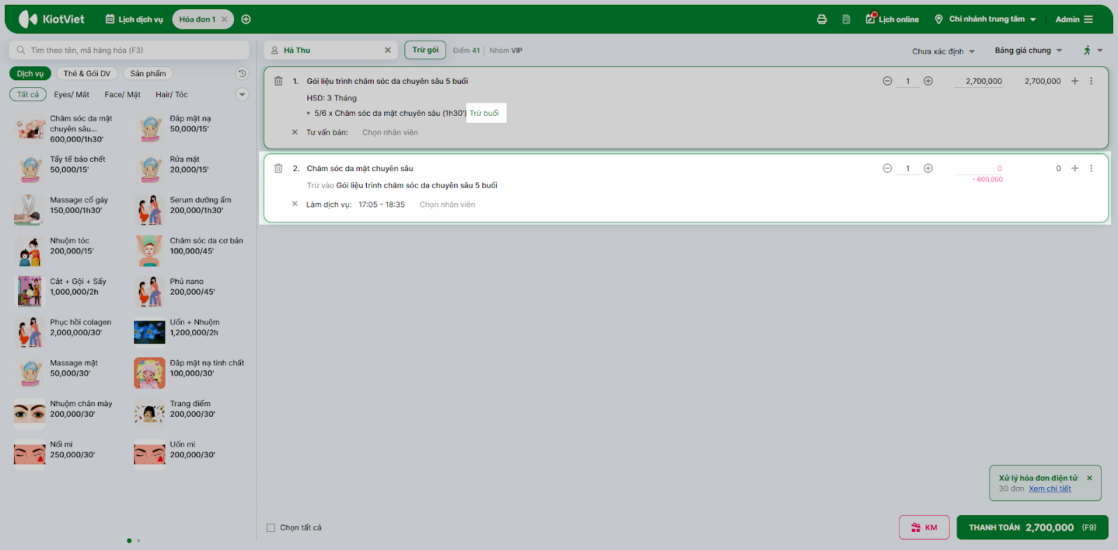 - Tình huống: Khách hàng mua gói “Chăm sóc da chuyên sâu 5 buổi”. Bạn cần tạo đơn bán gói này và trừ ngay 1 buổi đầu tiên khách sử dụng hôm nay.