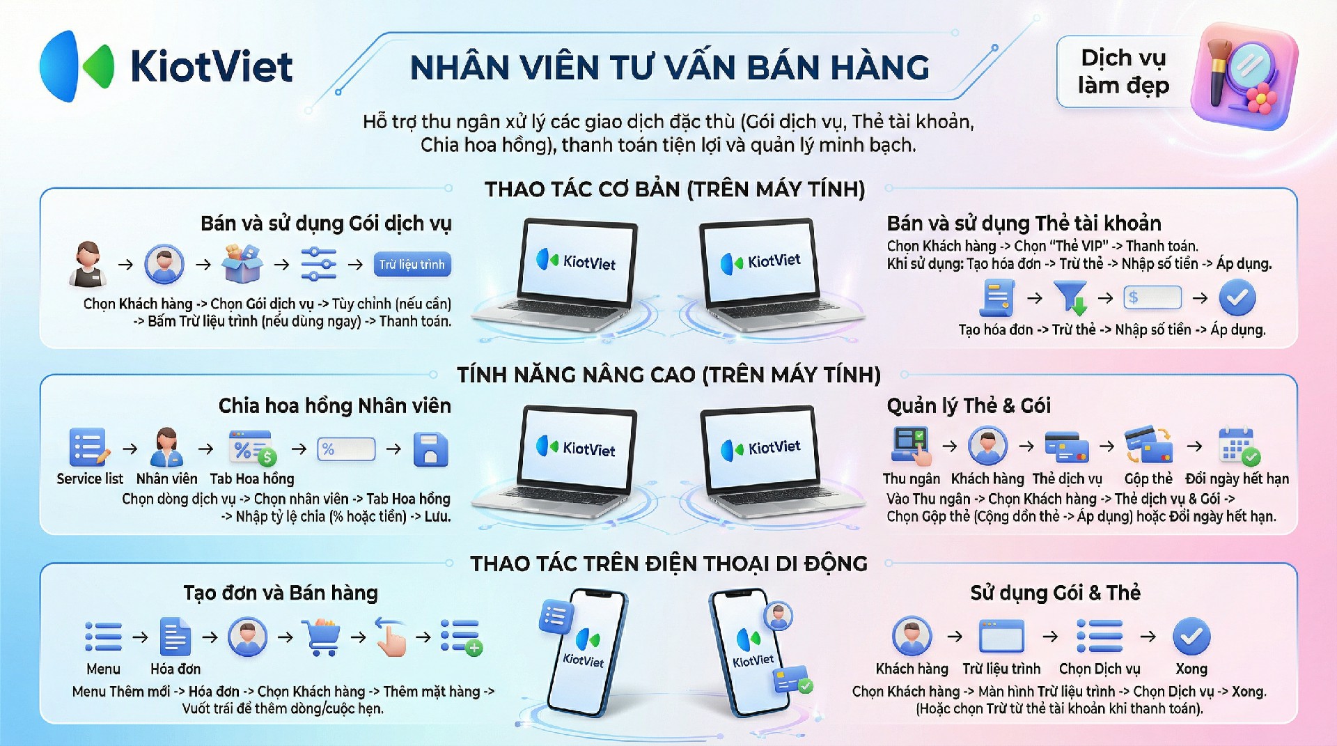 Tính năng Tư vấn bán hàng trên KiotViet hỗ trợ tối đa cho nhân viên thu ngân trong việc thực hiện các giao dịch phức tạp đặc thù của ngành làm đẹp như: Bán gói liệu trình, Bán thẻ trả trước, Trừ dịch vụ trong gói và Tính hoa hồng cho nhiều nhân viên cùng lúc.