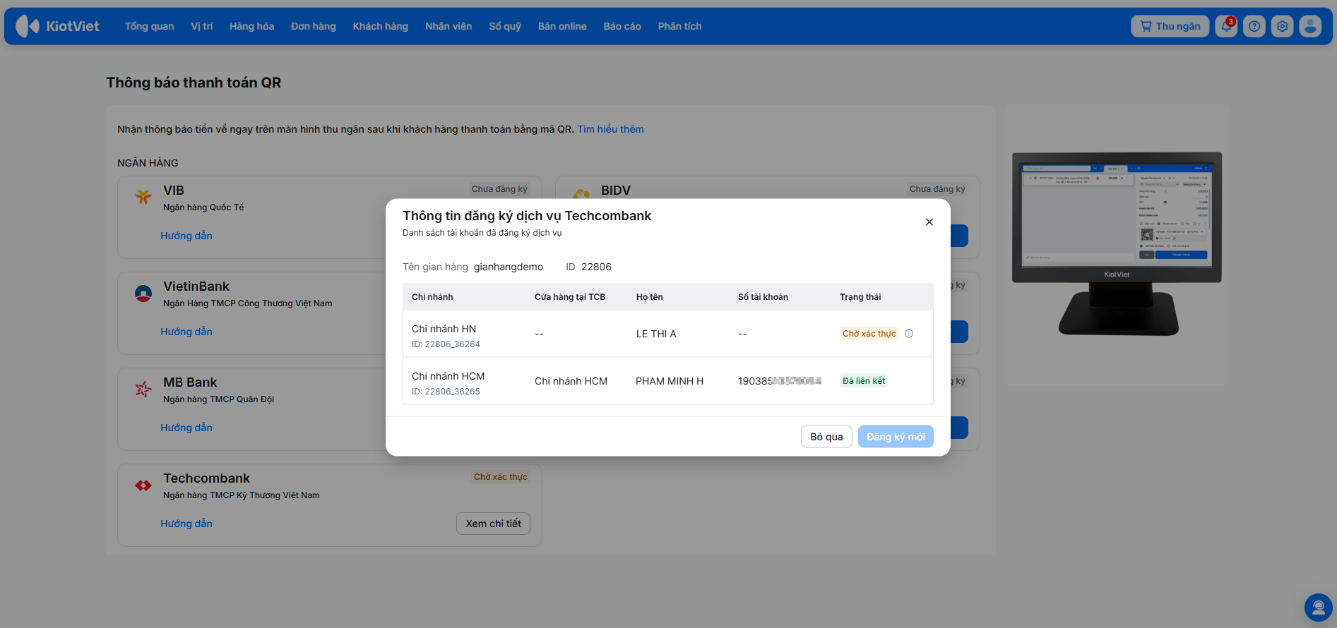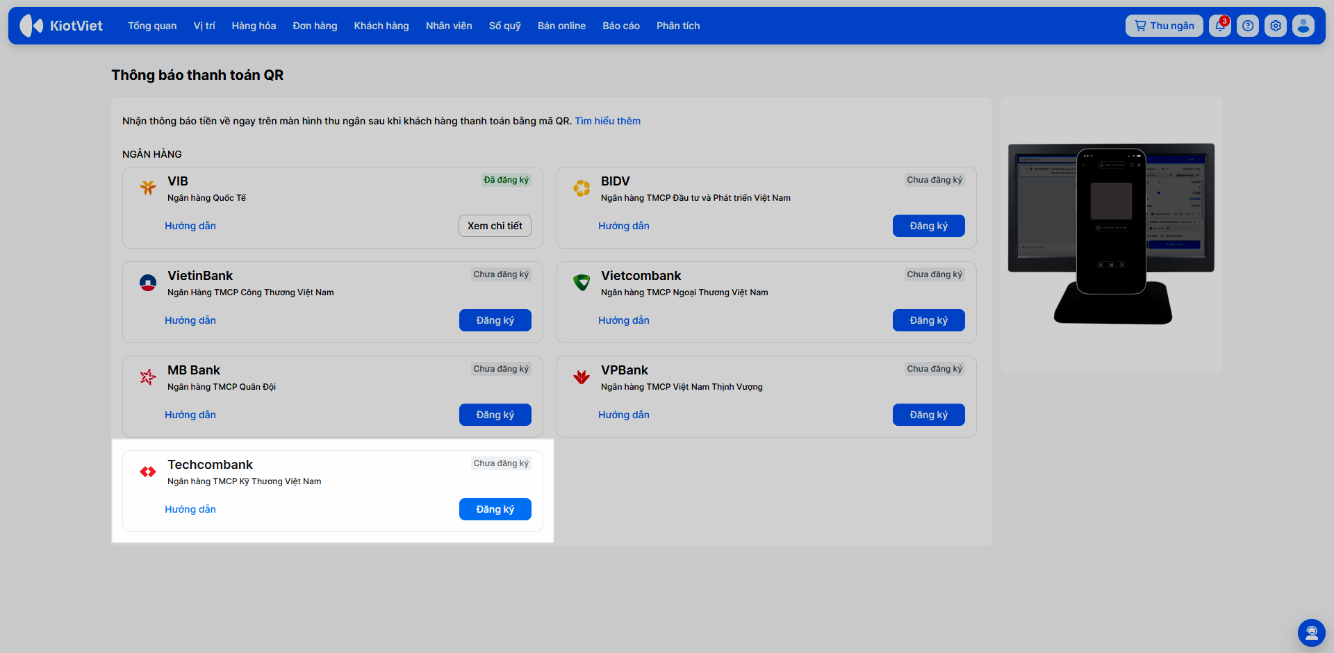 Để kích hoạt tính năng nhận thông báo thanh toán tự động, bạn cần hoàn tất việc đăng ký dịch vụ trên KiotViet và xác thực liên kết trên ứng dụng Techcombank Mobile.