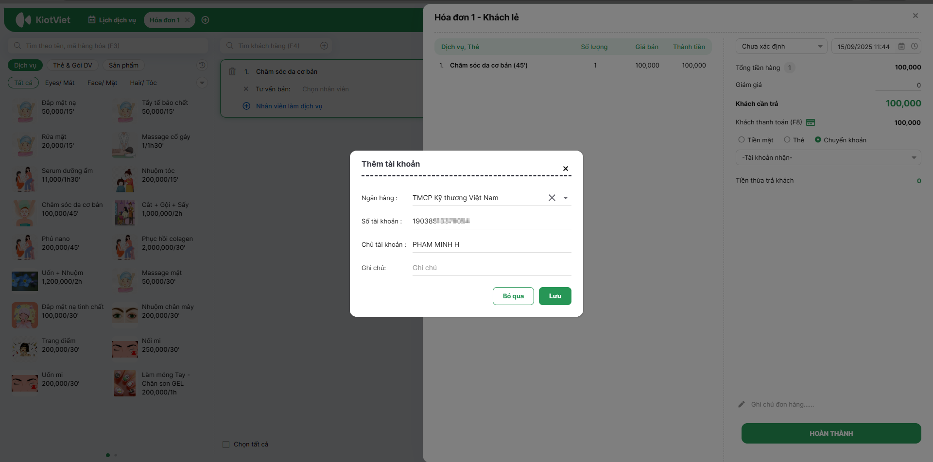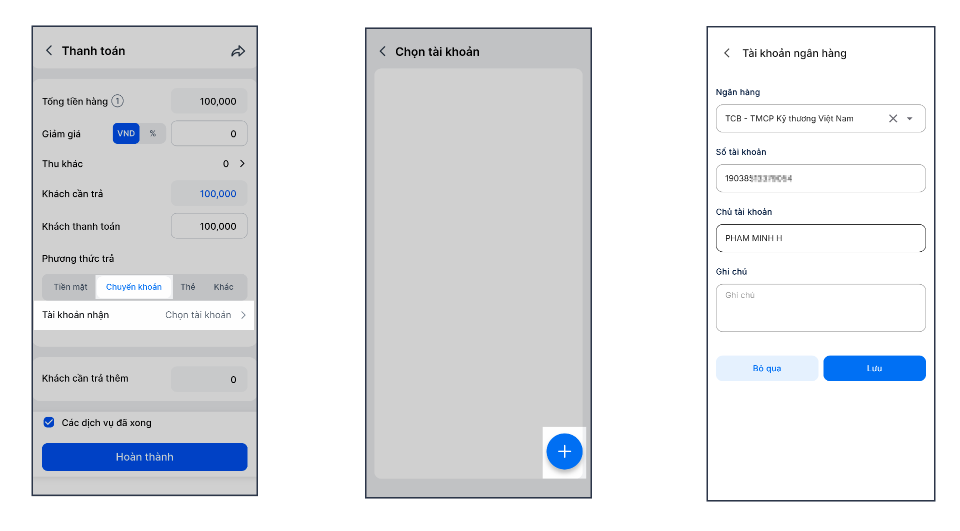 Ngoài ra, bạn cũng có thể thực hiện thao tác này ngay trên màn hình Thu ngân bằng cách chọn phương thức Chuyển khoản và nhấn Thêm tài khoản.