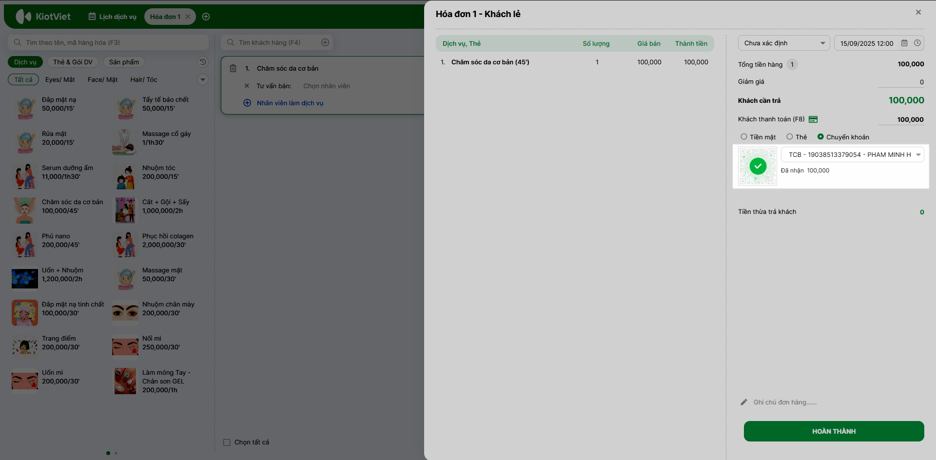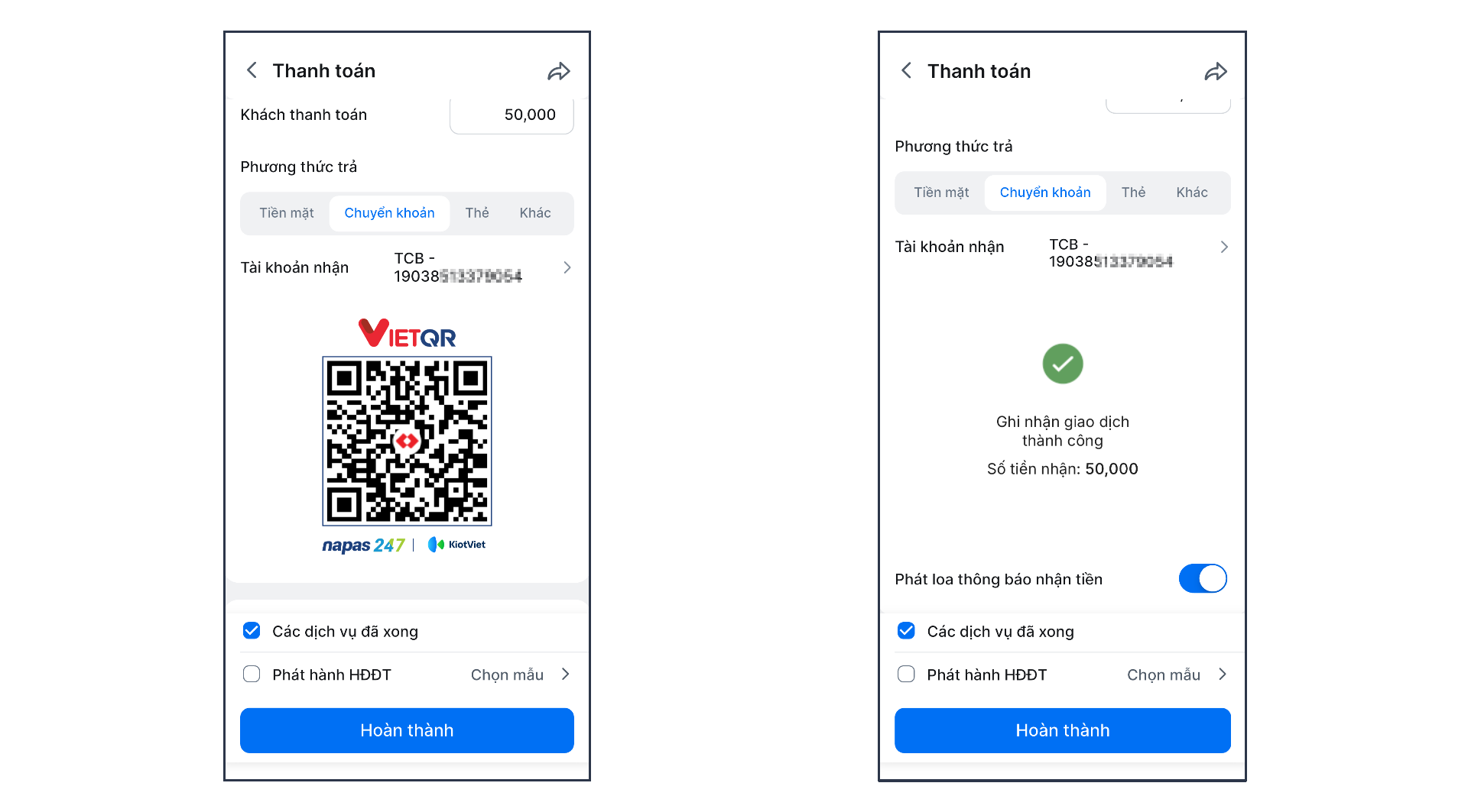 – Sau khi khách hàng quét mã và chuyển khoản thành công, màn hình Thu ngân sẽ ngay lập tức hiển thị thông báo kết quả giao dịch.