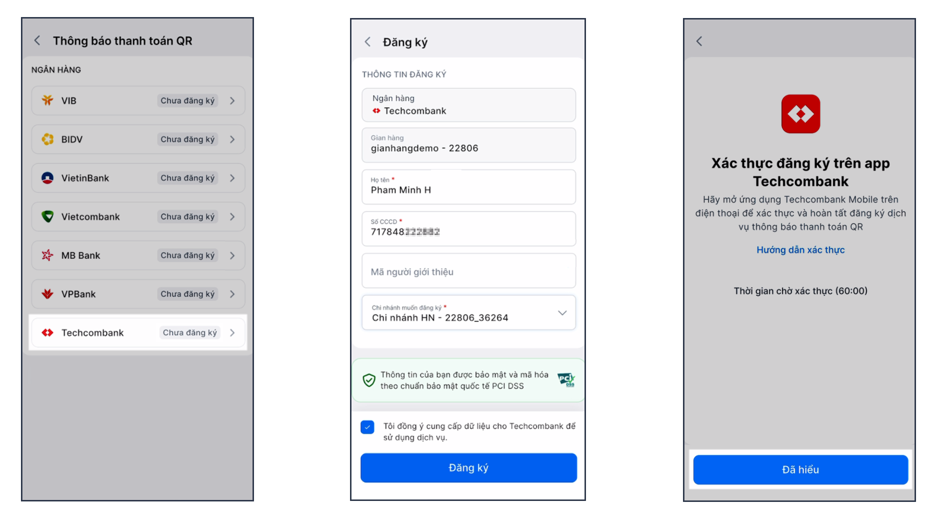 - Họ tên, Số CCCD: Phải trùng với thông tin đăng ký tại ngân hàng.