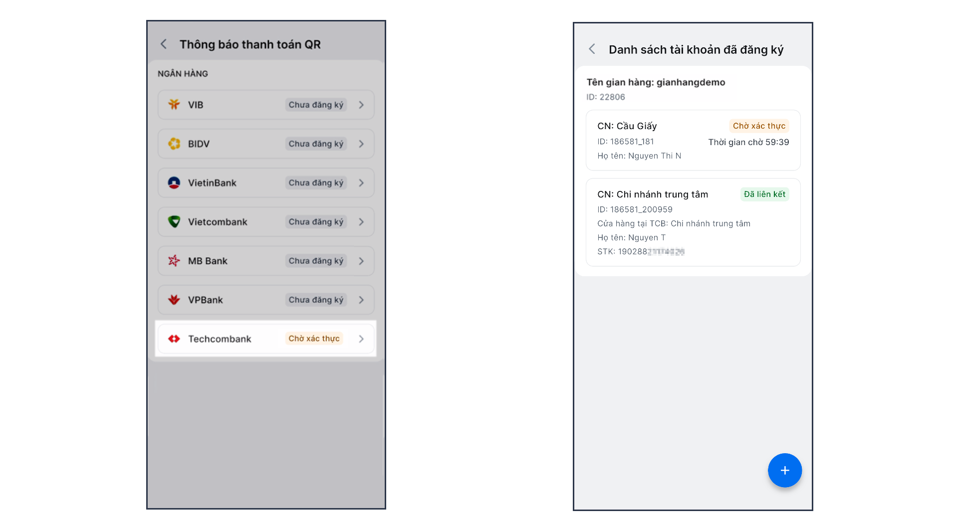 – Ứng dụng sẽ hiển thị danh sách các chi nhánh cùng trạng thái liên kết (Thành công, Thất bại, Chờ xác thực). Bạn có thể nhấn cộng để thêm liên kết cho chi nhánh khác.