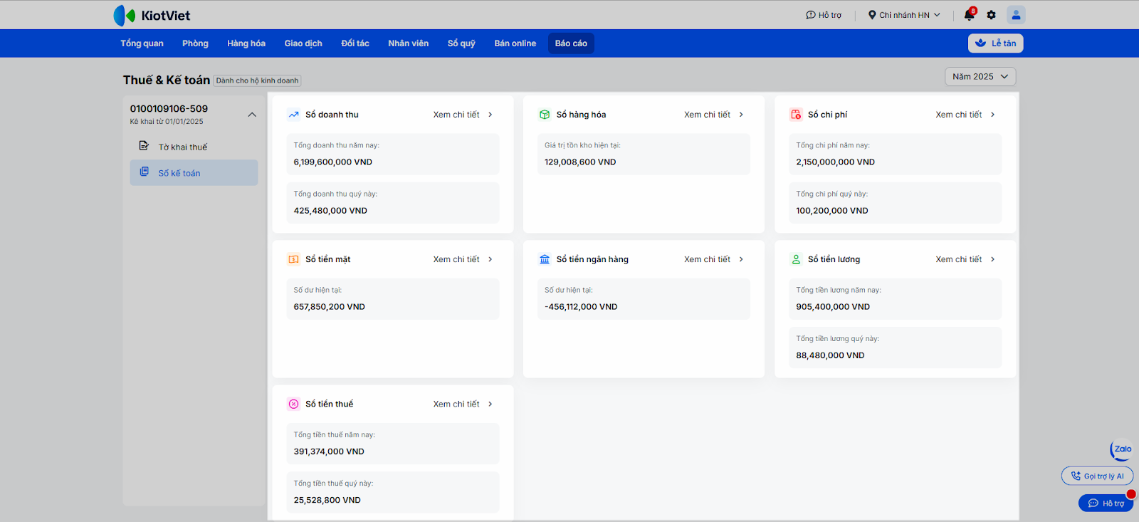 - Số đã trả: Ghi nhận từ các phiếu chi được tạo trong Sổ quỹ trên KiotViet với “Loại chi” là “Nộp thuế”.