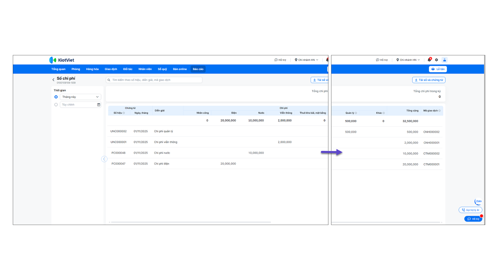 Từ Phiếu chi: Khi tạo Phiếu chi trong Sổ quỹ trên KiotViet, bạn có thể chọn chính xác loại chi thuộc các phân loại như: Điện, Nước, Viễn thông, Thuê mặt bằng/kho, Quản lý, Nhân công, Thuế, Khác. Dữ liệu này sẽ được đồng bộ chính xác sang Sổ chi phí.