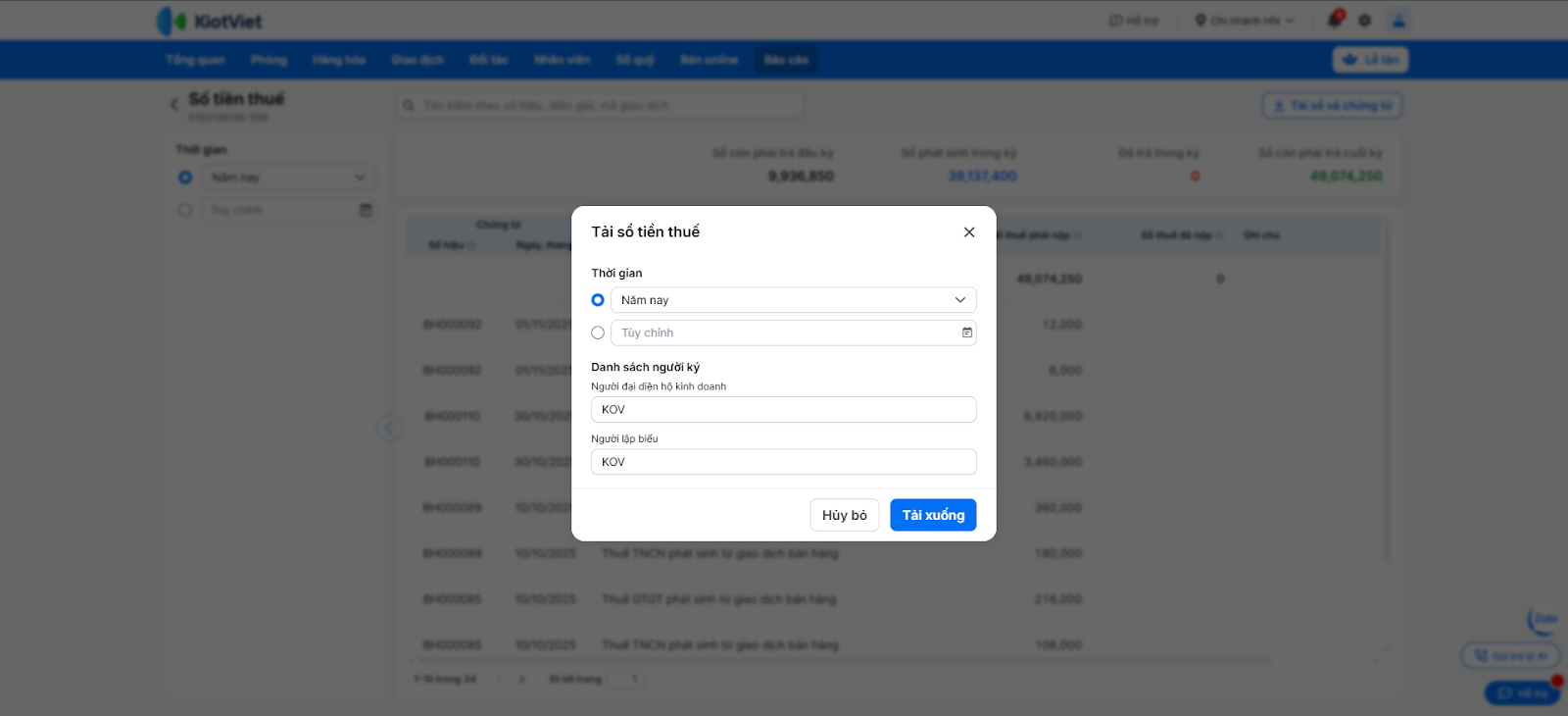 - Trong quá trình kê khai và lưu trữ thông tin kế toán, bạn có thể cần tải xuống toàn bộ sổ và chứng từ để phục vụ việc lưu trữ nội bộ hoặc gửi cho cơ quan quản lý. KiotViet hỗ trợ tải dữ liệu này dưới dạng file Excel, giúp bạn dễ dàng tra cứu, in ấn và lưu trữ lâu dài.