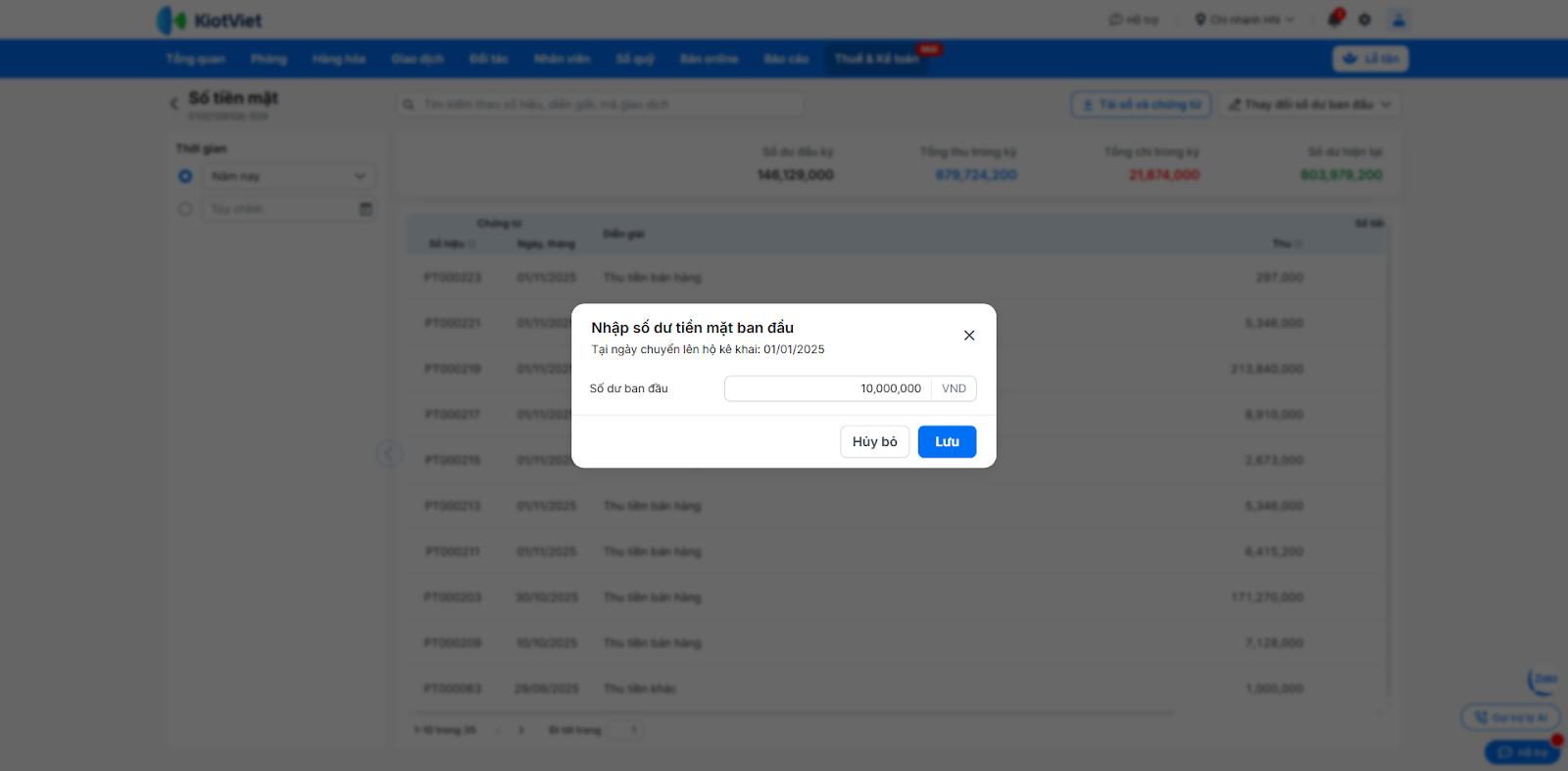 - Nhập số dư thủ công: Bạn nhập Số dư ban đầu → nhấn Lưu để ghi nhận thông tin.