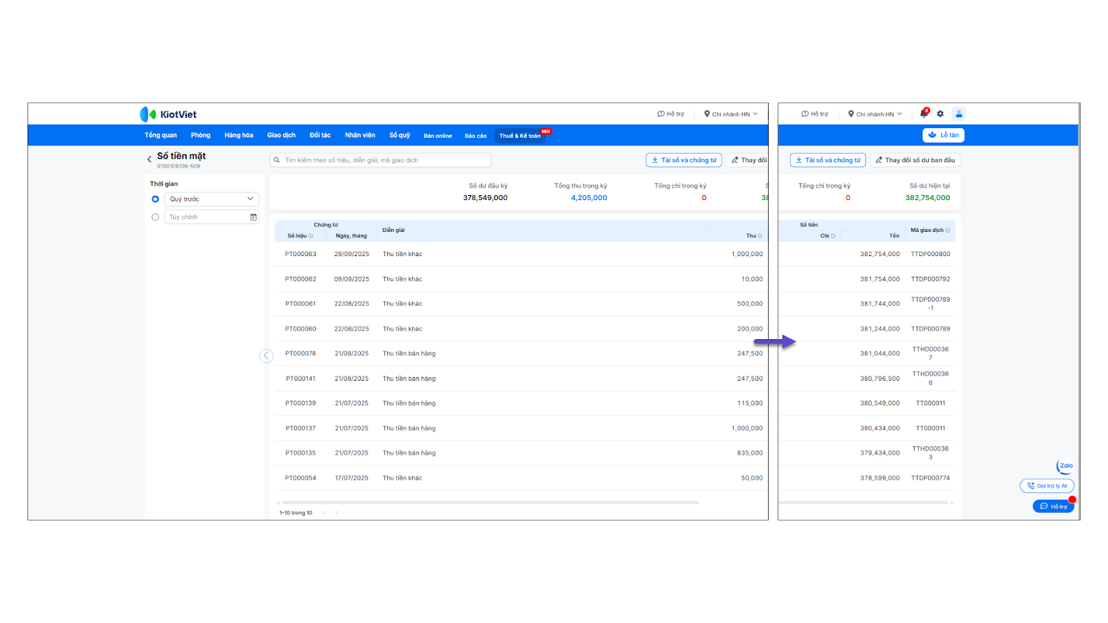 - Mỗi chứng từ là một phiếu thu hoặc phiếu chi trong Sổ quỹ trên KiotViet có phương thức là “Tiền mặt”.