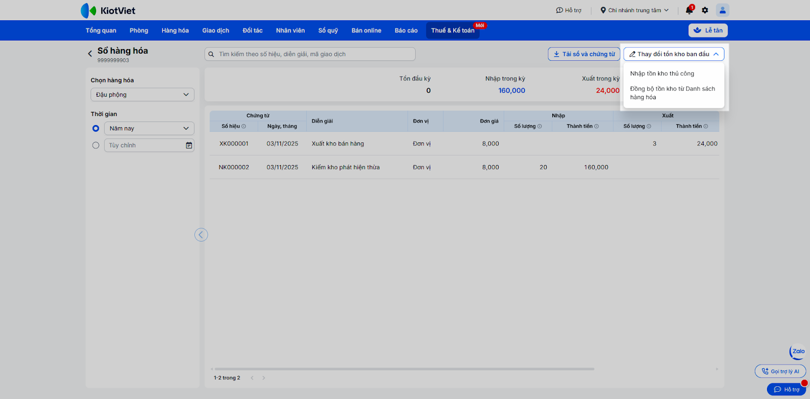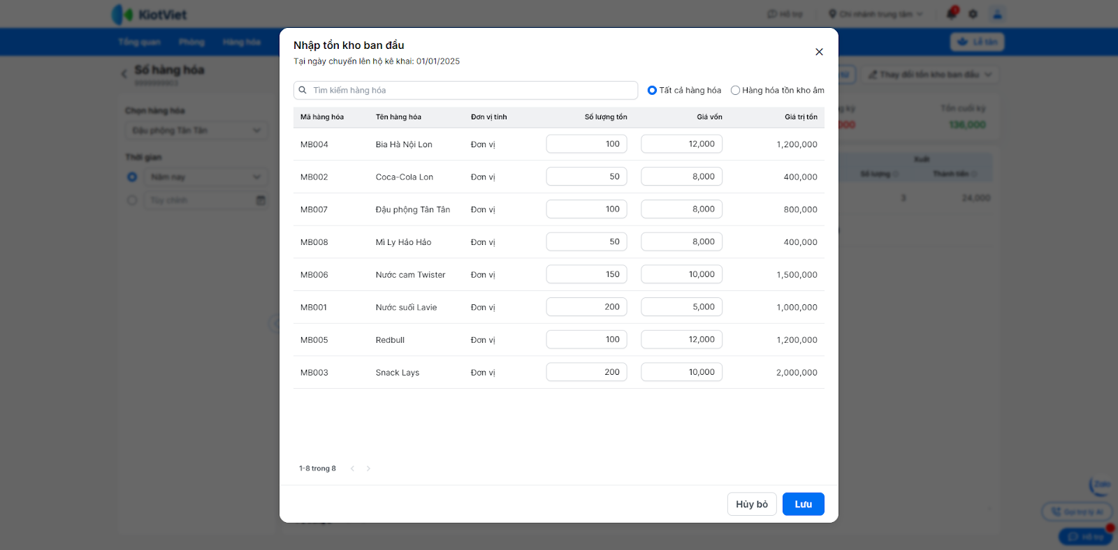 - Bạn có thể tìm kiếm hàng hóa hoặc chọn theo bộ lọc: Tất cả hàng hóa hoặc Hàng hóa tồn kho âm để nhập lại Số lượng tồn và Giá vốn.