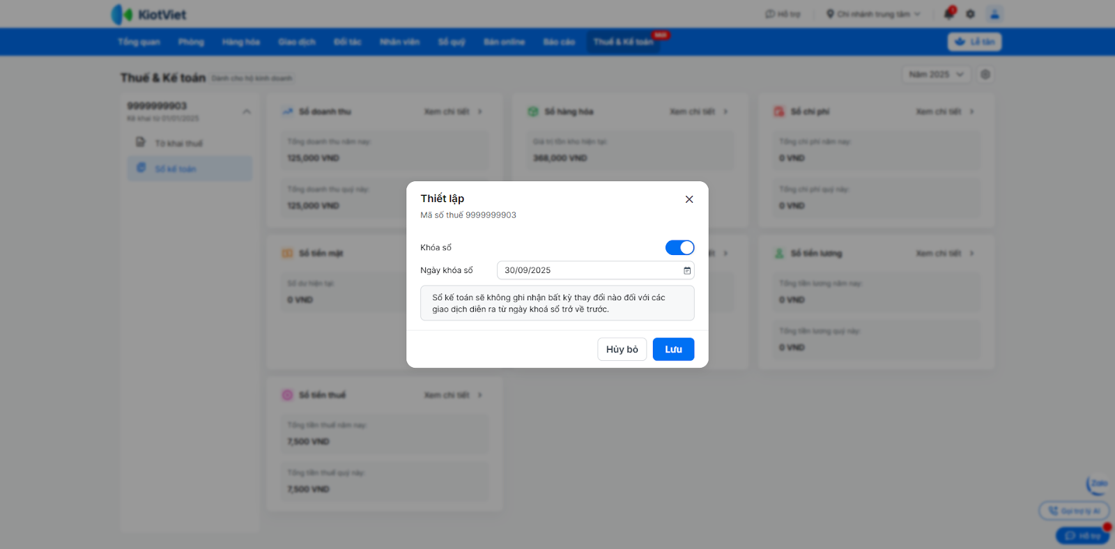 - Sau mỗi kỳ kê khai thuế, nếu đã kiểm tra, chỉnh sửa và chốt số liệu, gian hàng nên thực hiện khóa sổ kế toán đến hết kỳ kê khai đó để đảm bảo tính toàn vẹn dữ liệu.