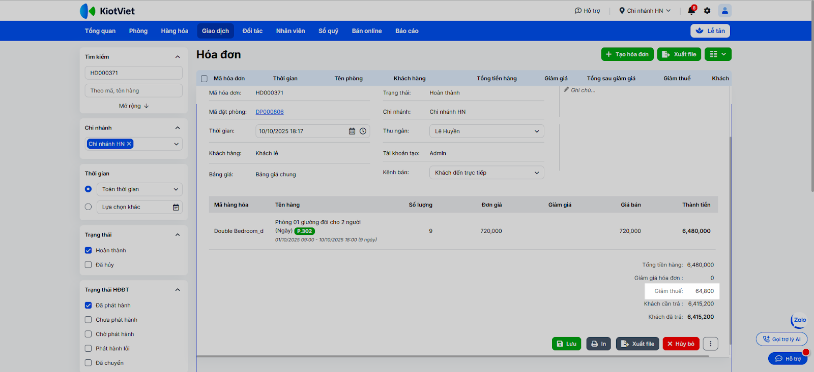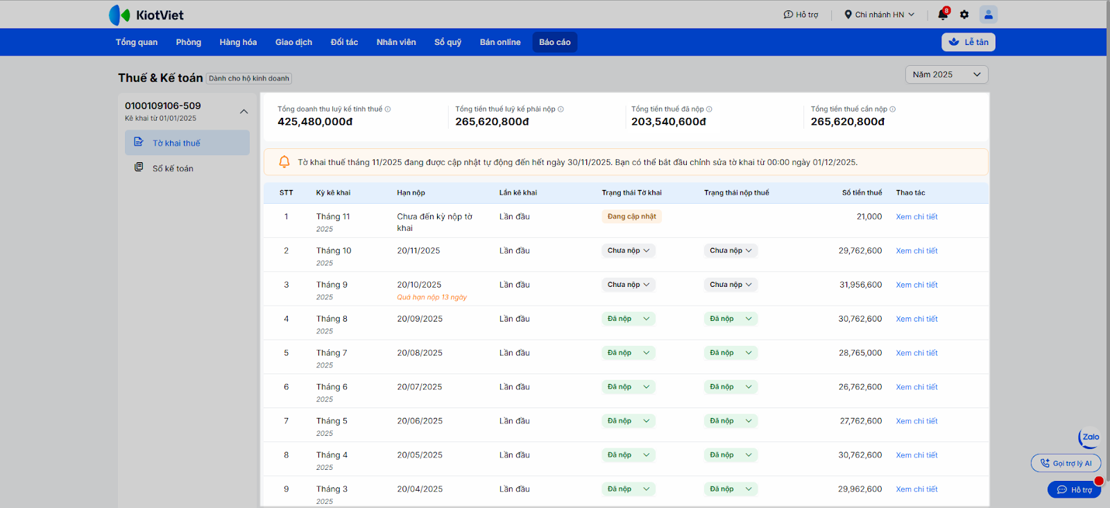 - Hệ thống tự động tổng hợp Doanh thu từ các giao dịch bán hàng trên KiotViet có phát hành hóa đơn điện tử trong kỳ và tự động tính toán số Thuế GTGT và TNCN phải nộp.