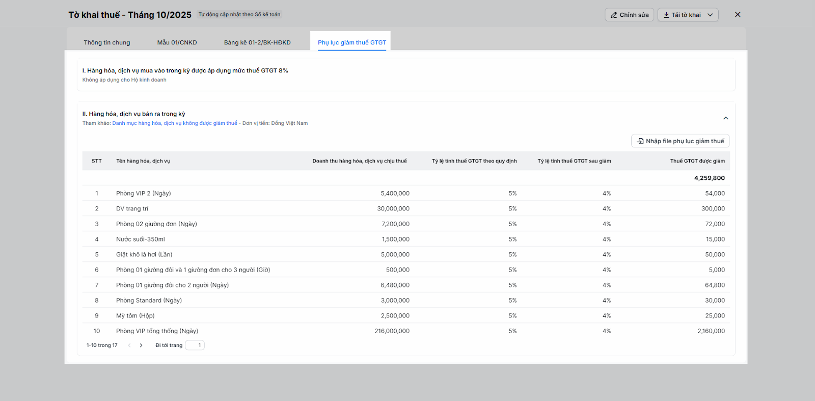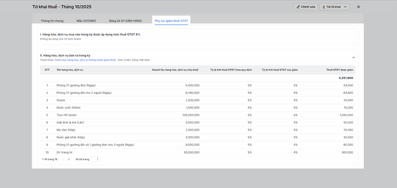 - Trong kỳ cửa hàng có giao dịch bán hàng có giảm thuế, phụ lục này sẽ tự động tổng hợp các giao dịch đó để đảm bảo bạn được hưởng đúng quyền lợi về thuế.