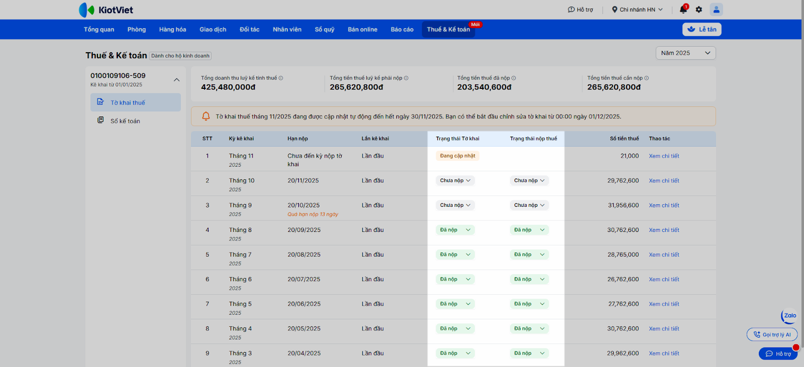 - Sau khi bạn đã nộp tờ khai, nộp thuế thành công cho cơ quan thuế, bạn muốn cập nhật trạng thái trên KiotViet để dễ dàng theo dõi.