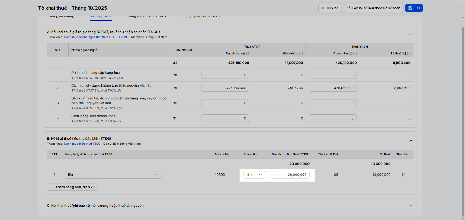 - B. Kê khai thuế tiêu thụ đặc biệt (TTĐB): Dành cho các hộ kinh doanh vũ trường, massage, karaoke hoặc các hàng hóa, dịch vụ khác chịu thuế tiêu thụ đặc biệt. Bạn cần tự kê khai doanh thu của các hàng hóa, dịch vụ chịu thuế tiêu thụ đặc biệt (hướng dẫn chi tiết mục 4. Khai báo thuế tiêu thụ đặc biệt). Nếu không kinh doanh các mặt hàng này, bạn có thể bỏ qua.
