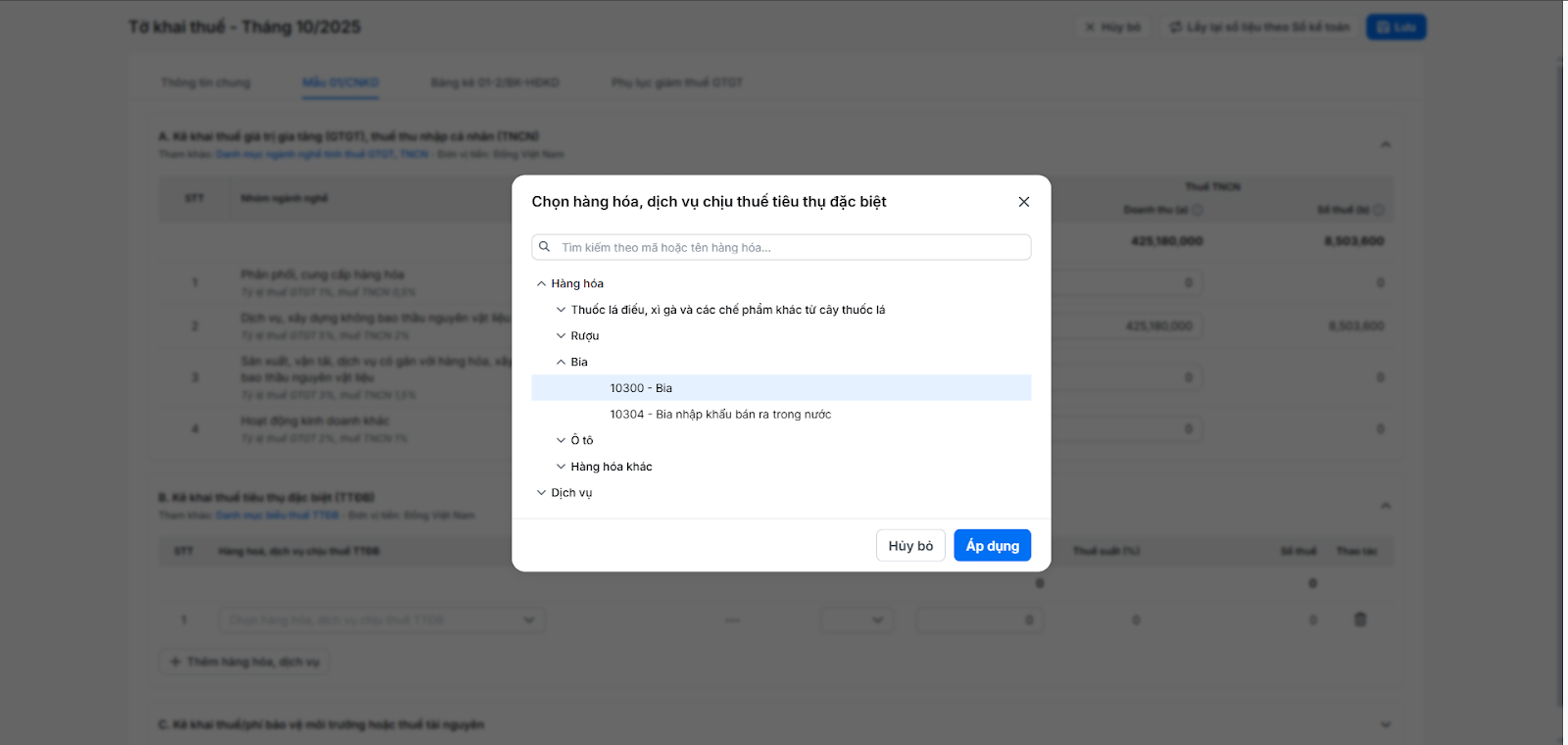(3) Tìm và chọn hàng hóa, dịch vụ chịu thuế tiêu thụ đặc biệt theo quy định → nhấn Áp dụng.