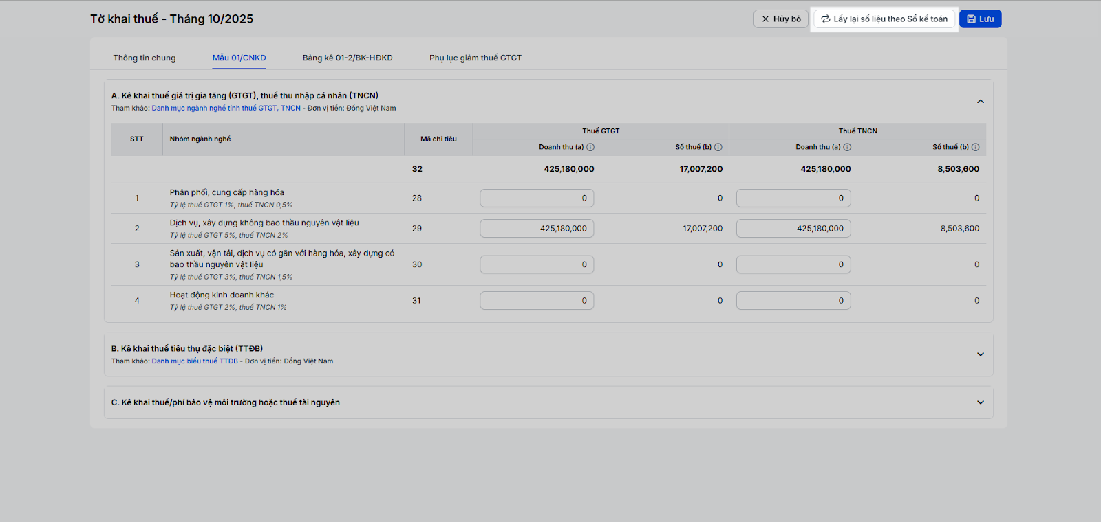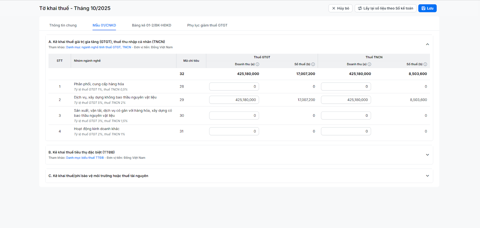 - Bảng A. Kê khai thuế giá trị gia tăng (GTGT), thuế thu nhập cá nhân (TNCN)