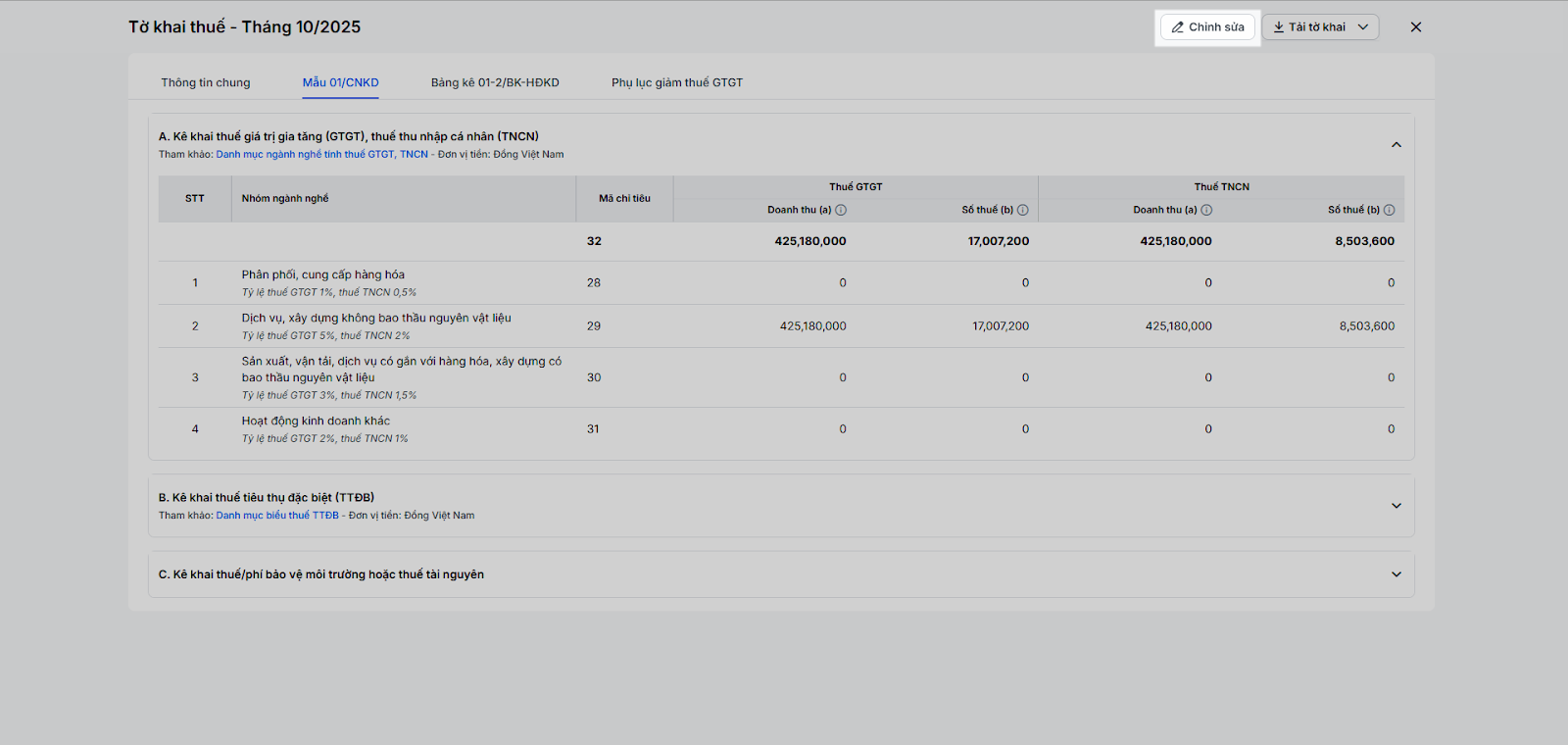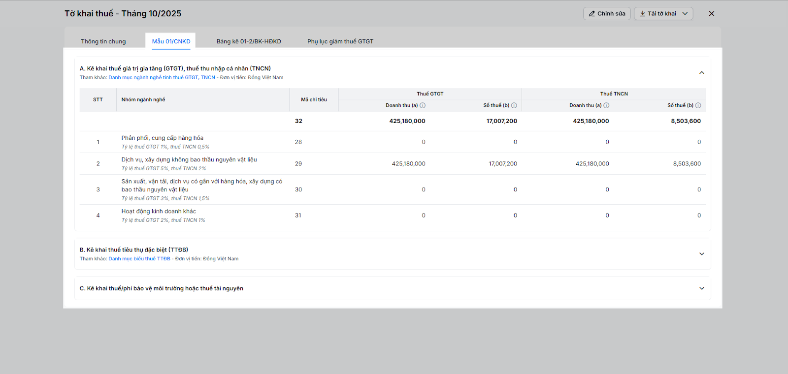 - C. Kê khai thuế/phí bảo vệ môi trường hoặc thuế tài nguyên: Nếu không kinh doanh các mặt hàng chịu thuế/phí này thì bạn có thể bỏ qua.