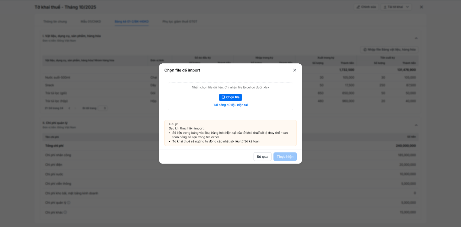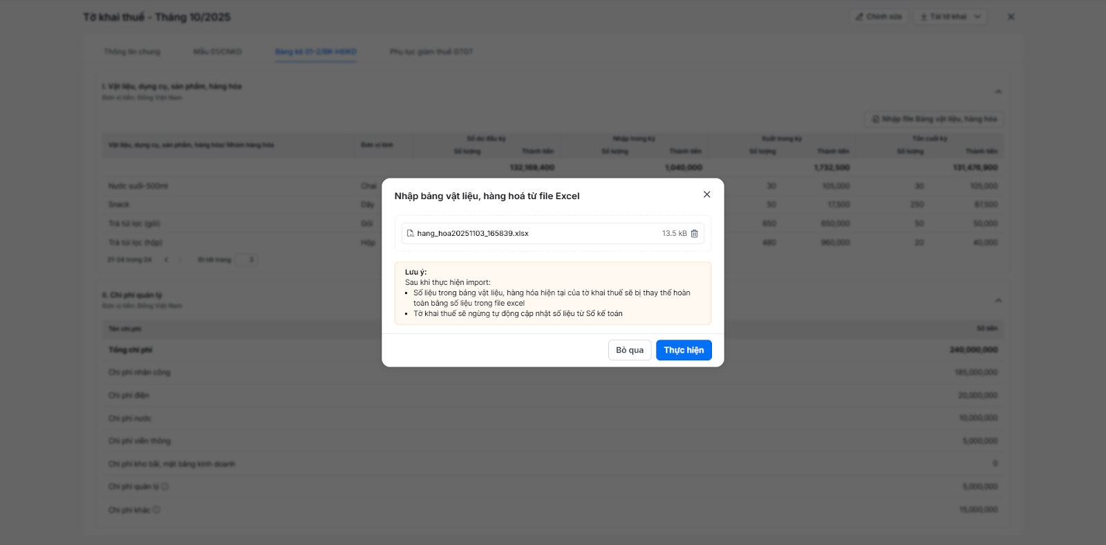 - Số liệu trong bảng vật liệu, hàng hóa hiện tại của tờ khai thuế sẽ bị thay thế hoàn toàn bằng số liệu trong file excel.