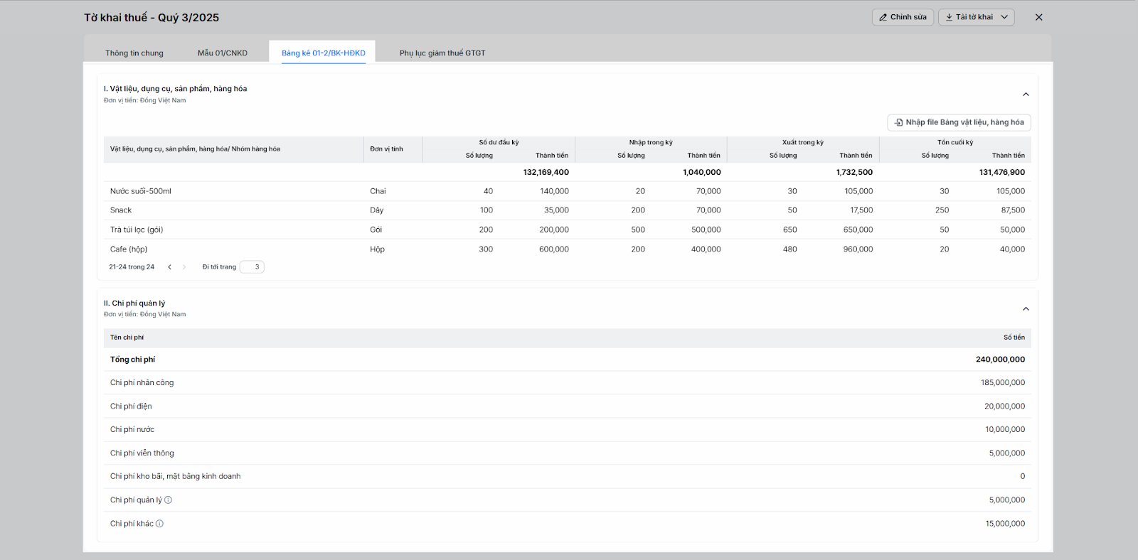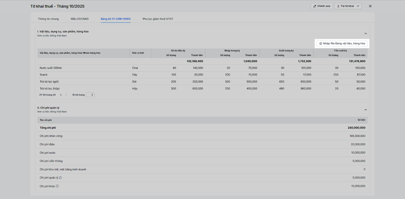 (3) Mục này lấy dữ liệu tồn kho, nhập, xuất trong kỳ (tương ứng Sổ hàng hóa) và các khoản chi phí (tương ứng Sổ chi phí). Gồm 2 bảng kê khai: