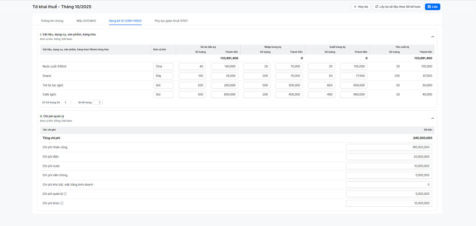 - Cửa hàng cần theo dõi các thông tin cung cấp chi tiết về dòng luân chuyển hàng hóa (tồn kho, nhập, xuất) và các chi phí quản lý trong Bảng kê 01-2/BK-HÐKD của một kỳ kê khai cụ thể