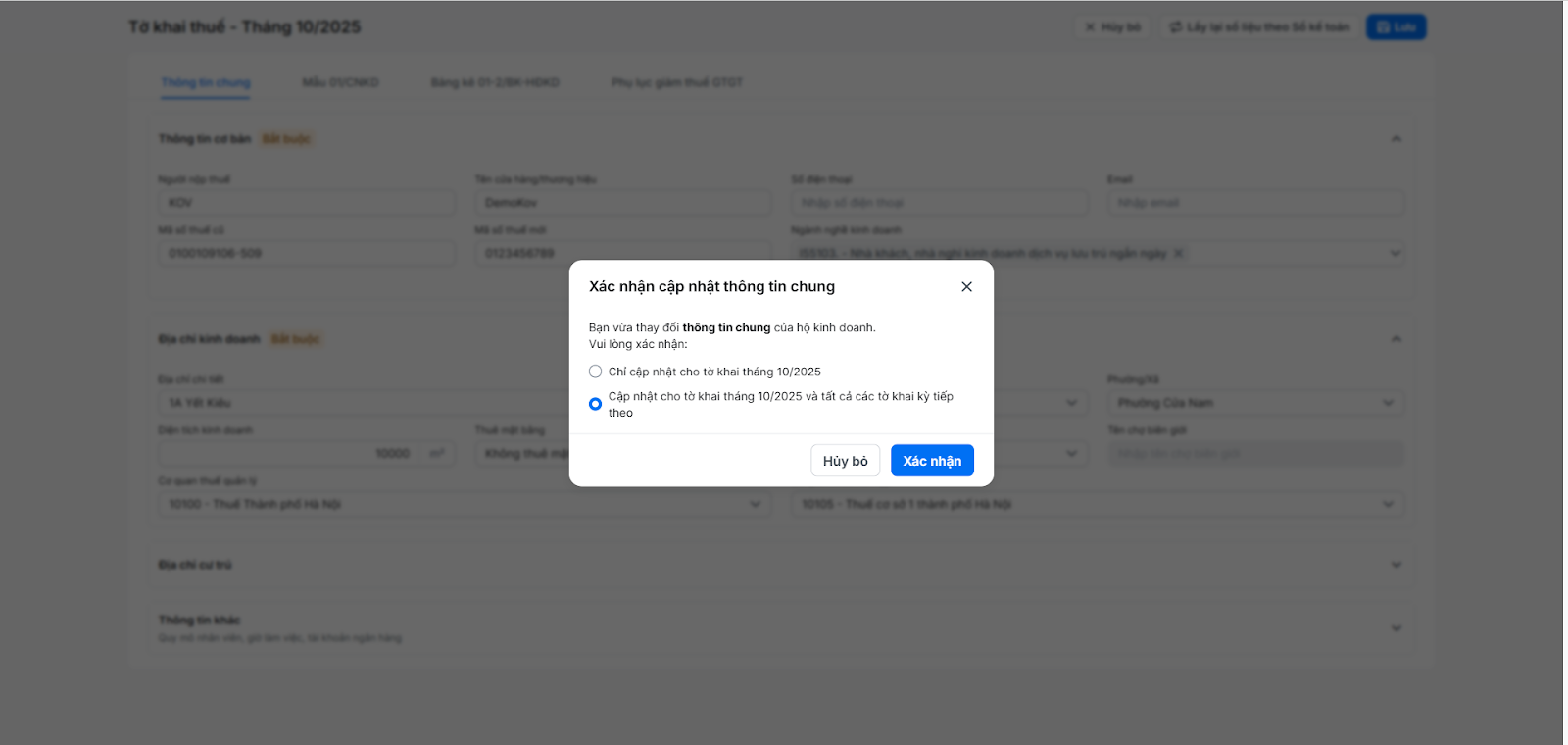 - Cập nhật cho tờ khai đang thao tác và tất cả các tờ khai kỳ tiếp theo.