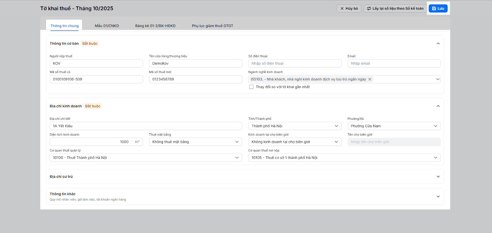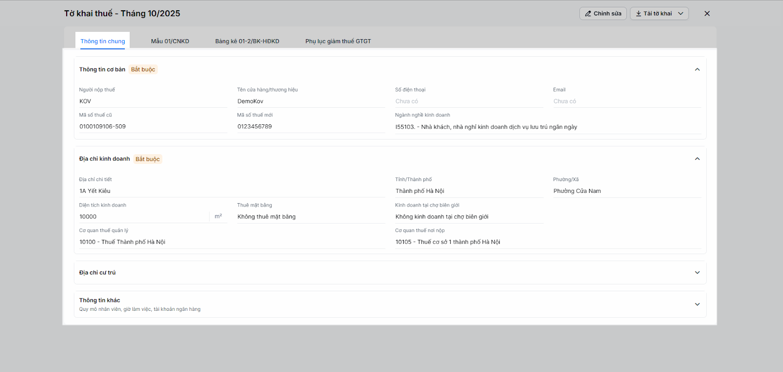 - Cửa hàng cần theo dõi các thông tin cơ bản, địa chỉ kinh doanh, địa chỉ cư trú cần hiển thị trên tờ khai 01/CNKD