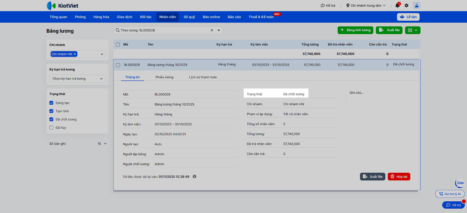 - Chi phí nhân công: Dữ liệu được tổng hợp từ các bảng lương đã chốt trên KiotViet.