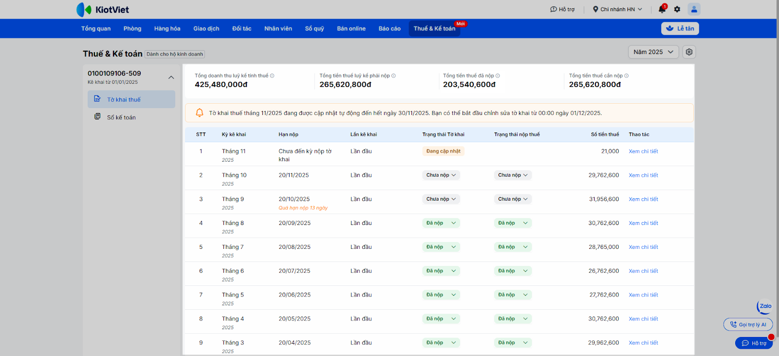 (1) Thuế & Kế toán → Tờ khai thuế, cửa hàng chọn kỳ kê khai và nhấn Xem chi tiết một tờ khai mình quan tâm