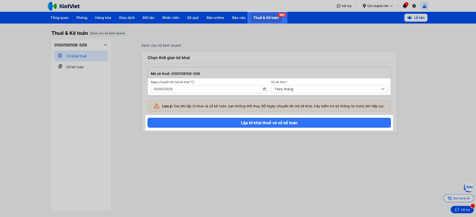 (3) Nhấn nút Lập tờ khai thuế và Sổ kế toán.