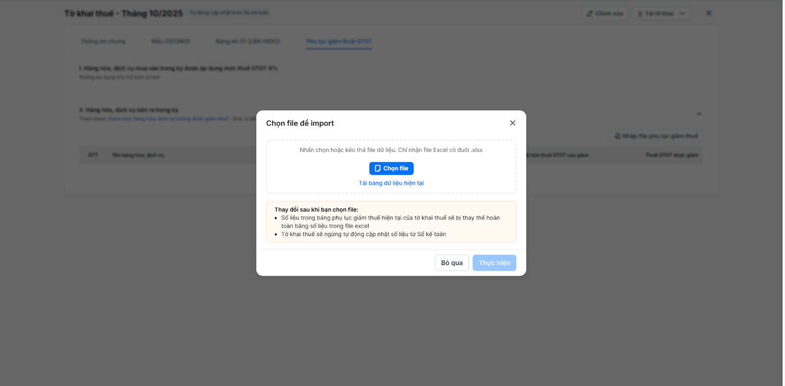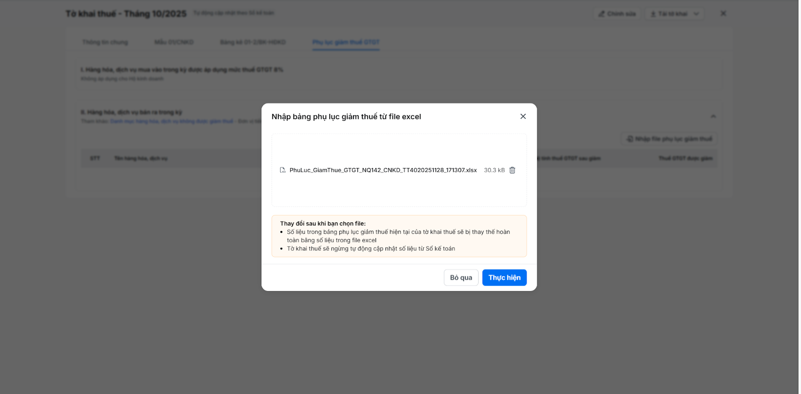 - Số liệu trong phụ lục giảm thuế của tờ khai thuế sẽ bị thay thế hoàn toàn bằng số liệu trong file excel.