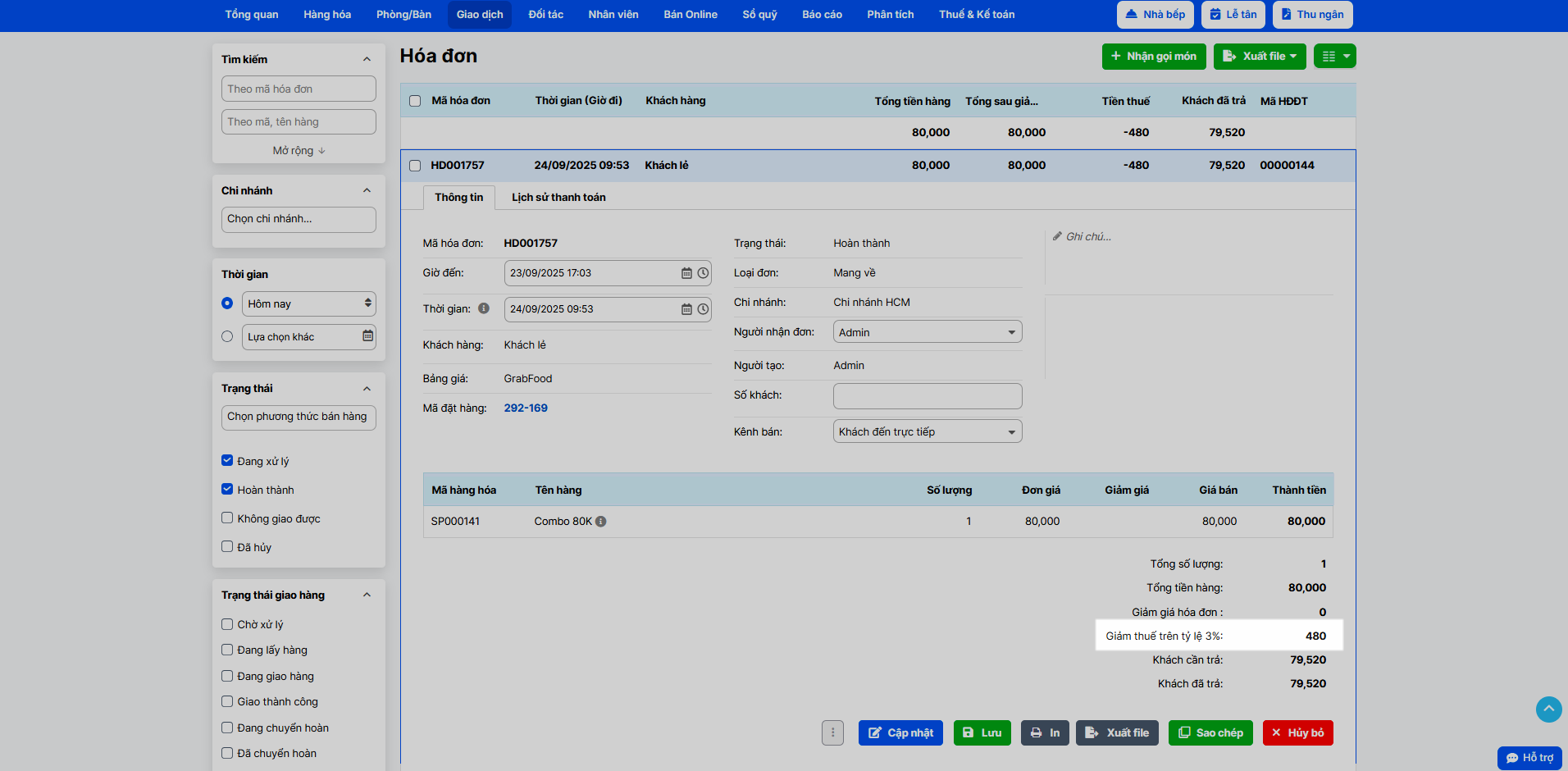 - Giao dịch xuất kho bao gồm: Bán hàng (có xuất hóa đơn điện tử), trả hàng nhà cung cấp, xuất hủy, kiểm kho thiếu, chuyển hàng.