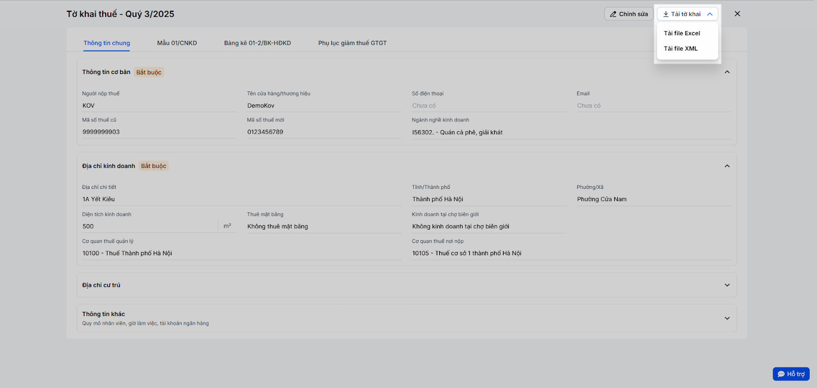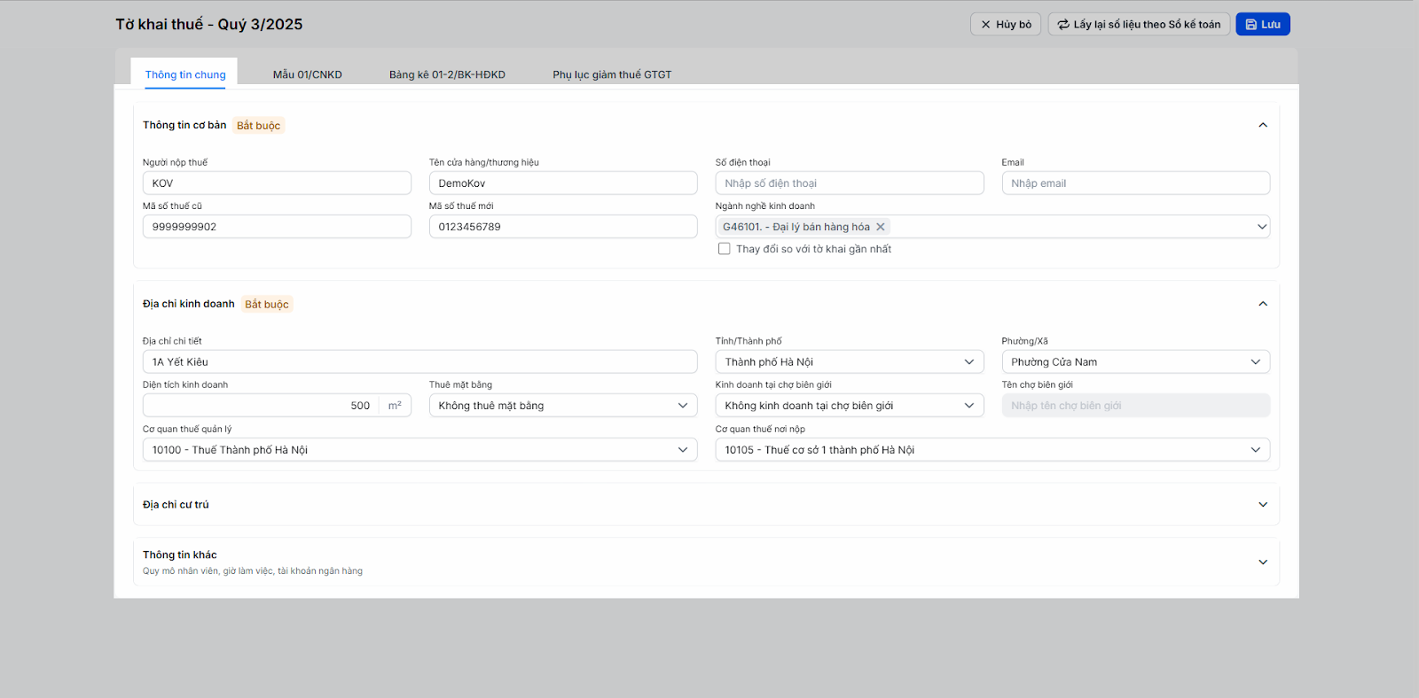 - Cửa hàng cần theo dõi các thông tin cơ bản, địa chỉ kinh doanh, địa chỉ cư trú cần hiển thị trên tờ khai 01/CNKD
