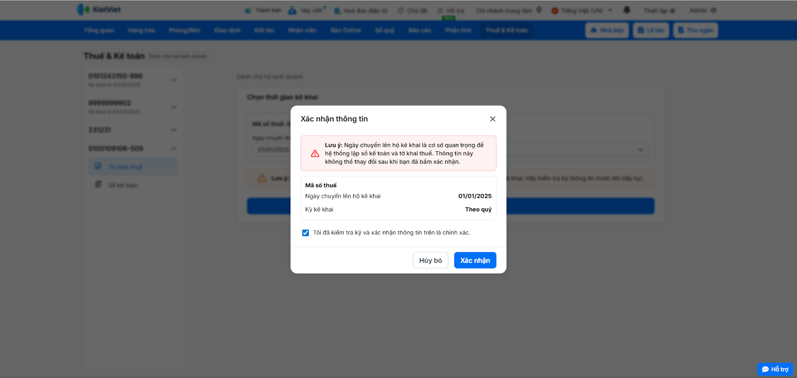 - Sau khi bạn đã nộp tờ khai, nộp thuế thành công cho cơ quan thuế, bạn muốn cập nhật trạng thái trên KiotViet để dễ dàng theo dõi.