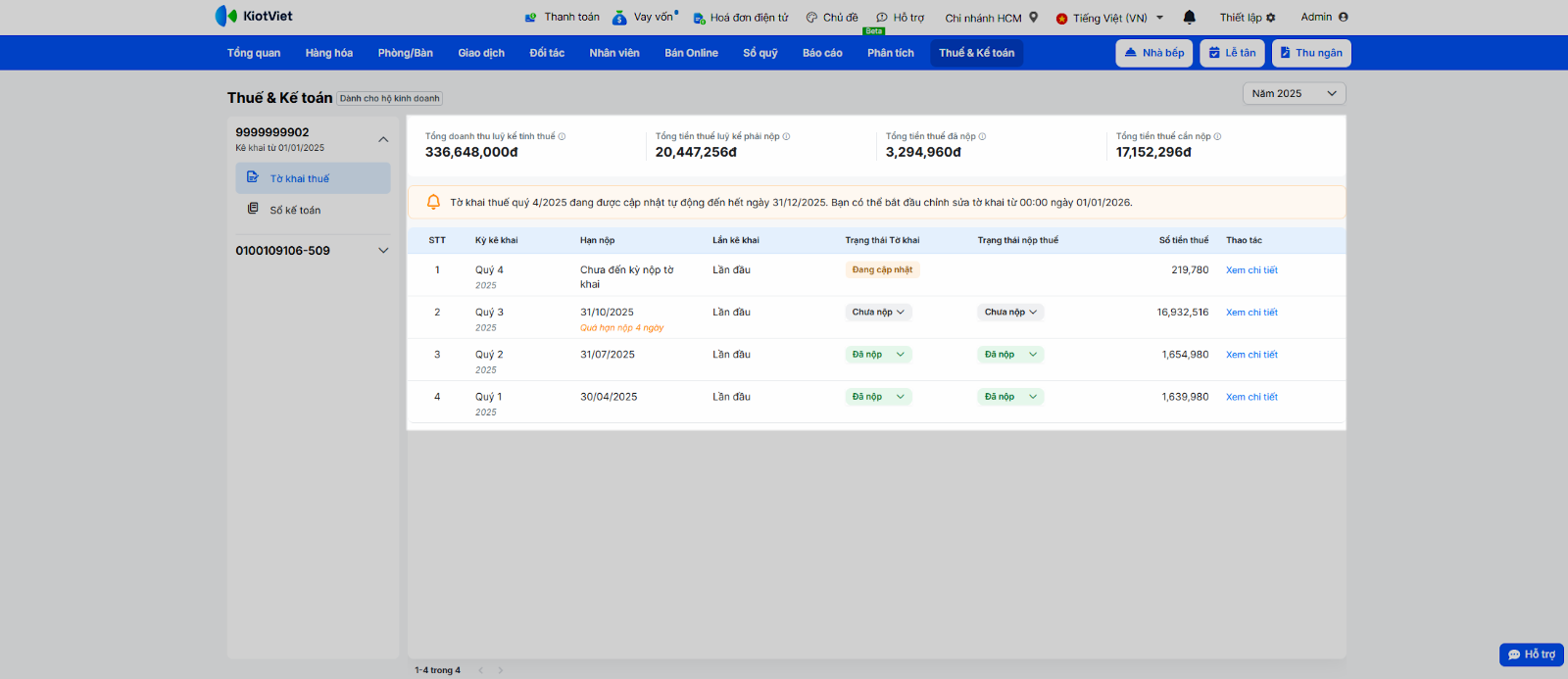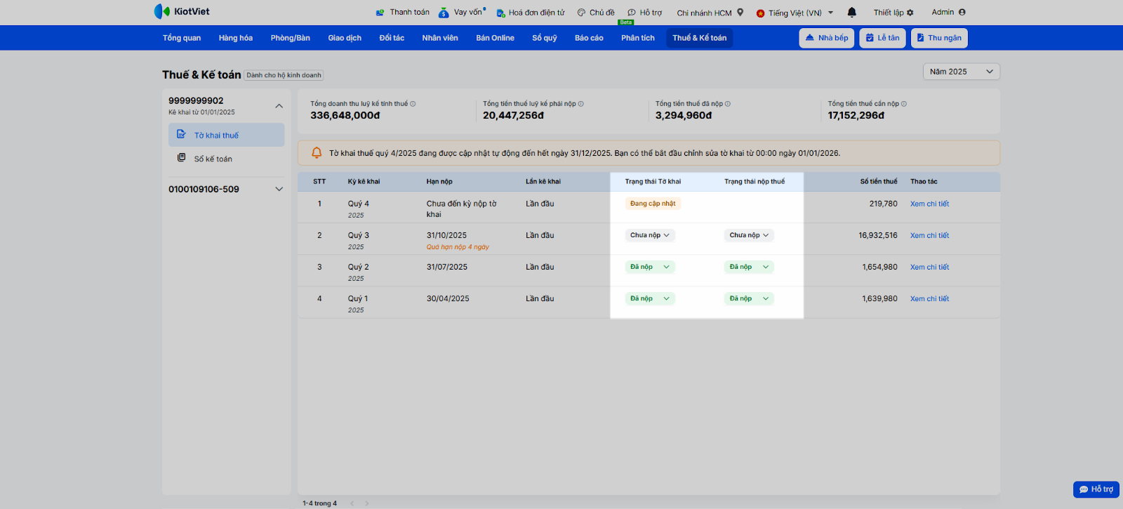 - Hệ thống tự động tổng hợp Doanh thu từ các giao dịch bán hàng trên KiotViet có phát hành hóa đơn điện tử trong kỳ và tự động tính toán số Thuế GTGT và TNCN phải nộp.