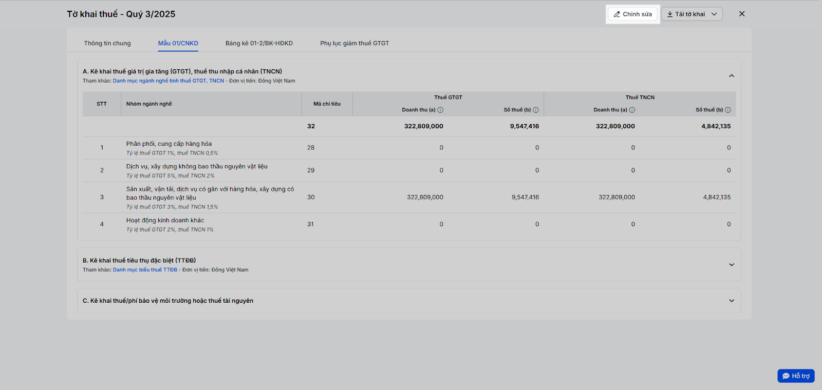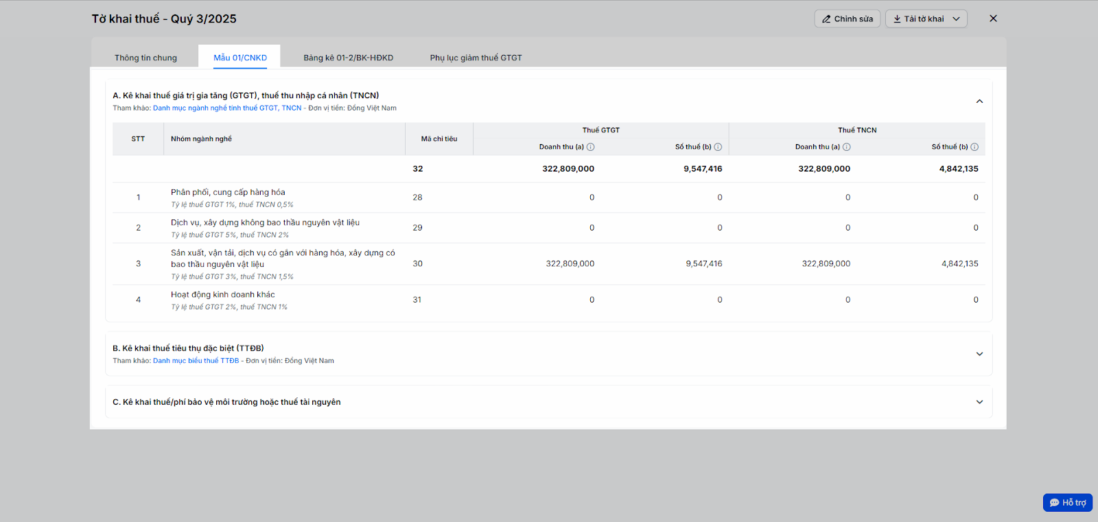 - C. Kê khai thuế/phí bảo vệ môi trường hoặc thuế tài nguyên: Nếu không kinh doanh các mặt hàng chịu thuế/phí này thì bạn có thể bỏ qua.