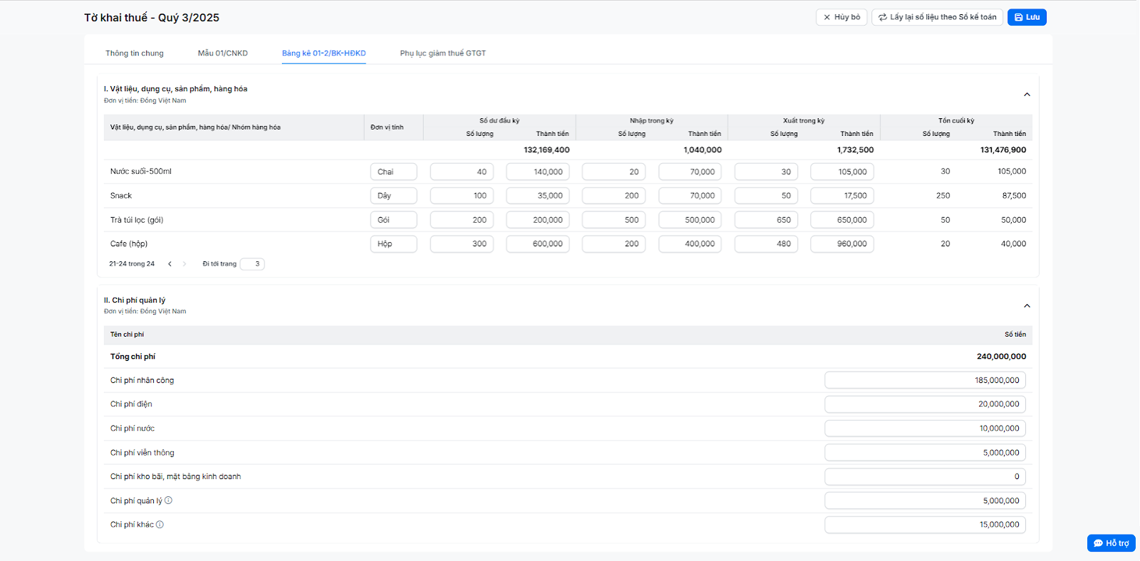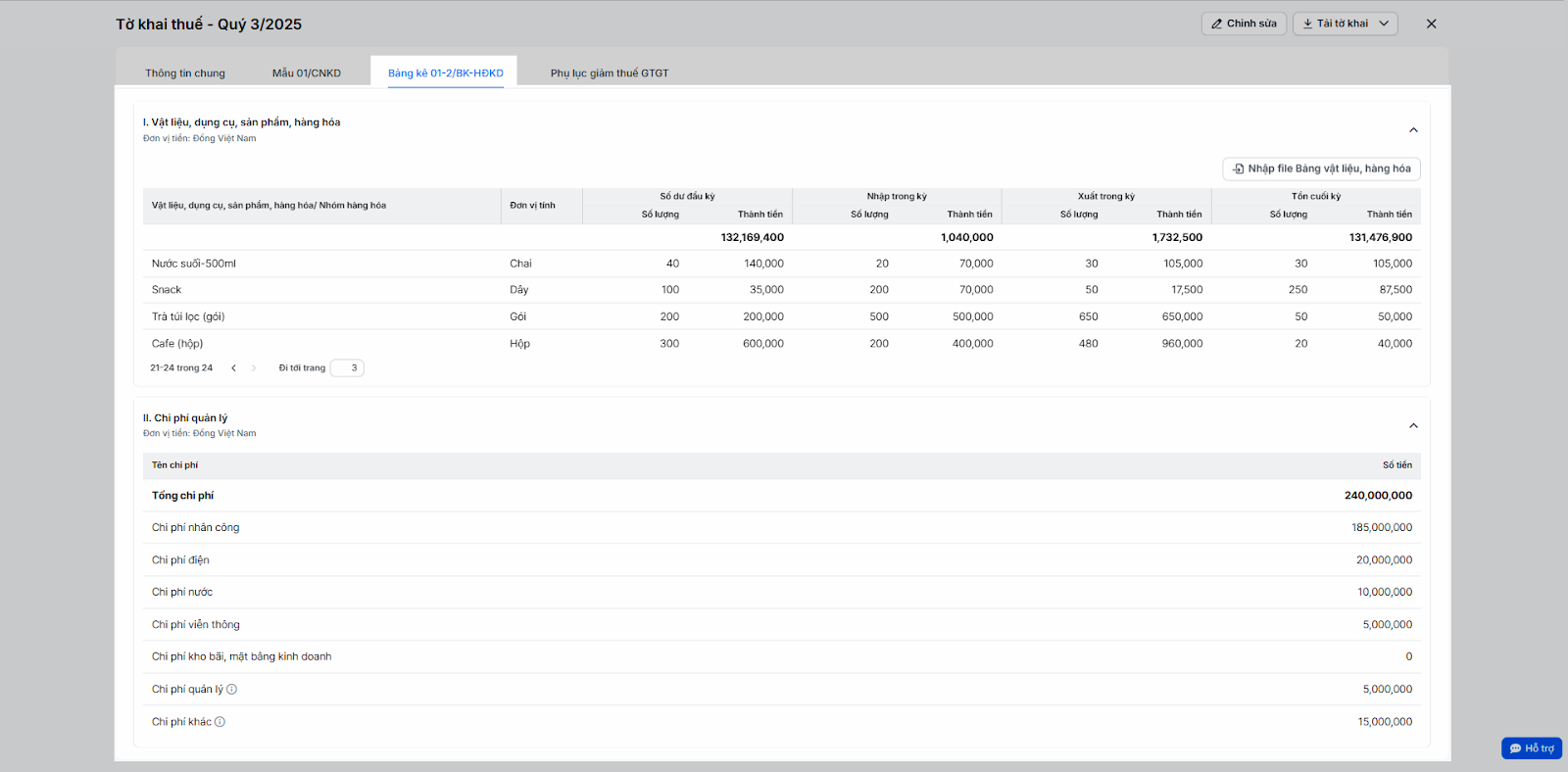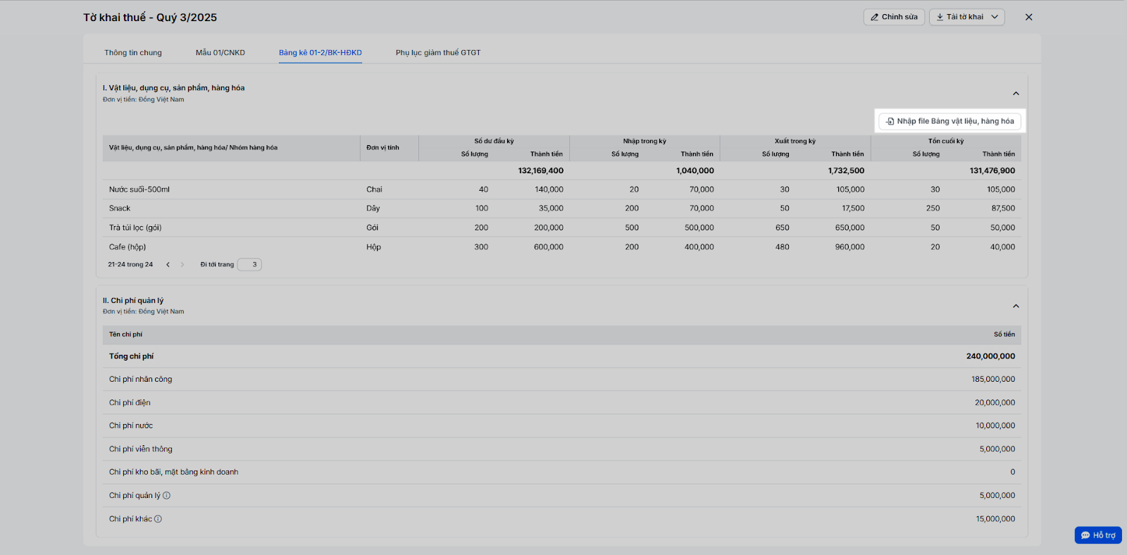(3) Mục này lấy dữ liệu tồn kho, nhập, xuất trong kỳ (tương ứng Sổ hàng hóa) và các khoản chi phí (tương ứng Sổ chi phí). Gồm 2 bảng kê khai: