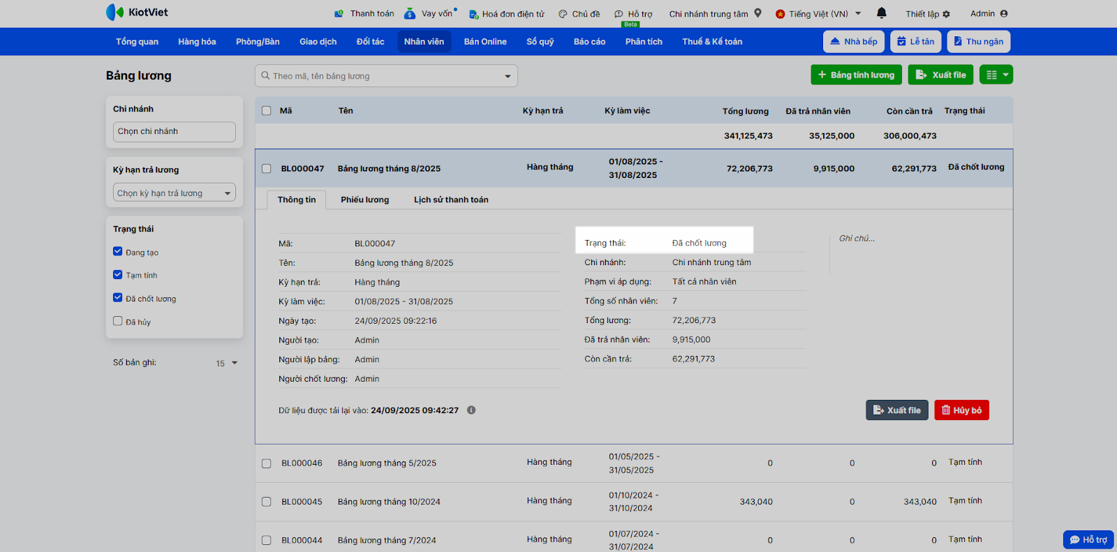 - Chi phí nhân công: Dữ liệu được tổng hợp từ các bảng lương đã chốt trên KiotViet.
