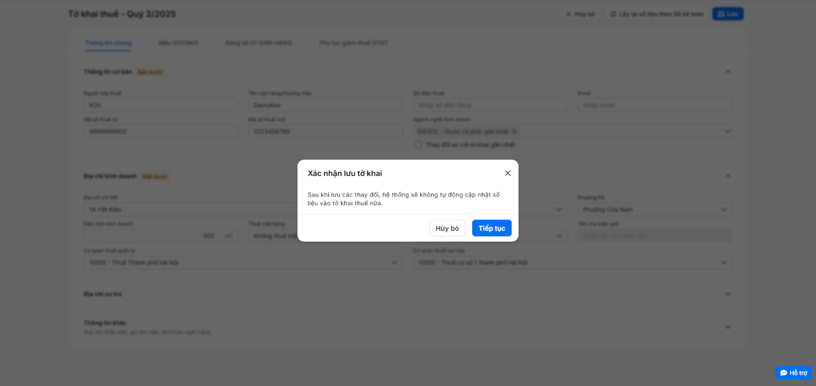 Lưu ý: Một khi bạn đã nhấn Lưu sau khi chỉnh sửa, tờ khai sẽ không được tự động cập nhật nếu có các giao dịch được thêm mới, chỉnh sửa trong kỳ này.