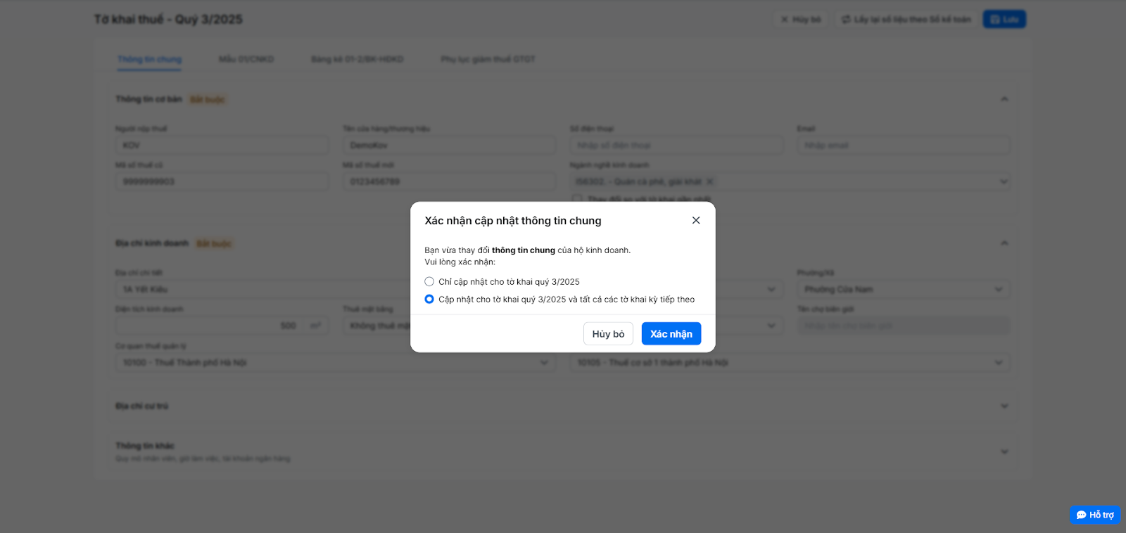 - Cập nhật cho tờ khai đang thao tác và tất cả các tờ khai kỳ tiếp theo.