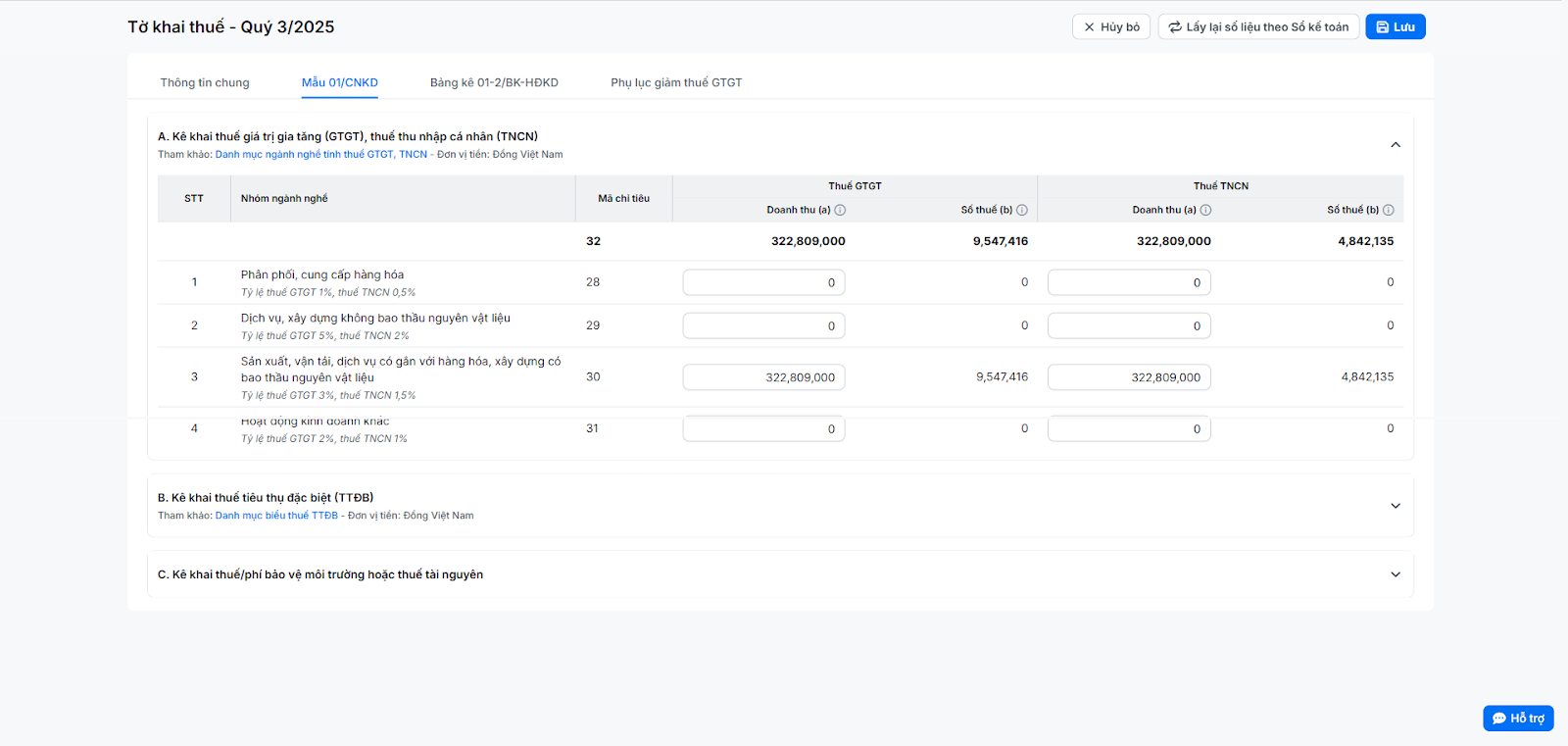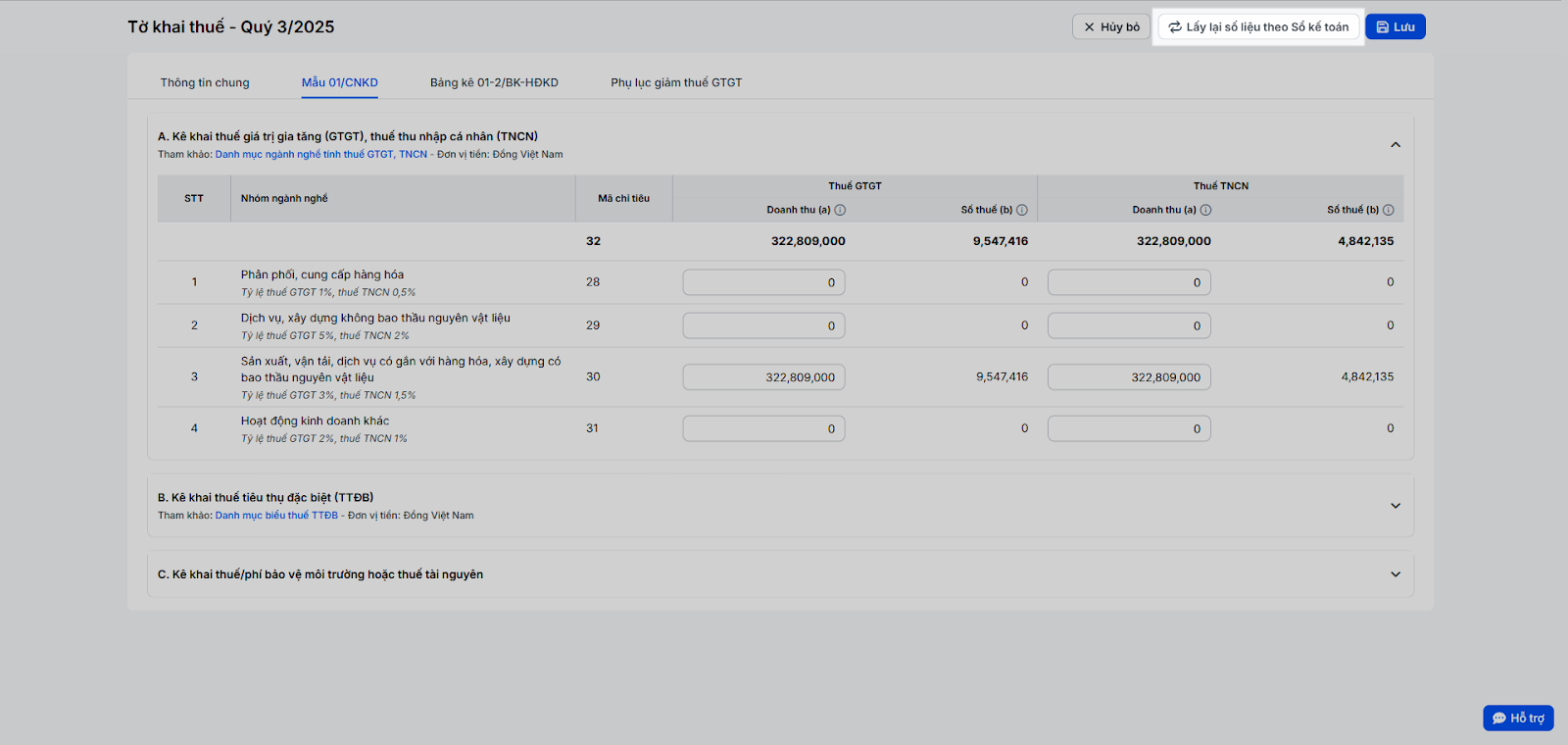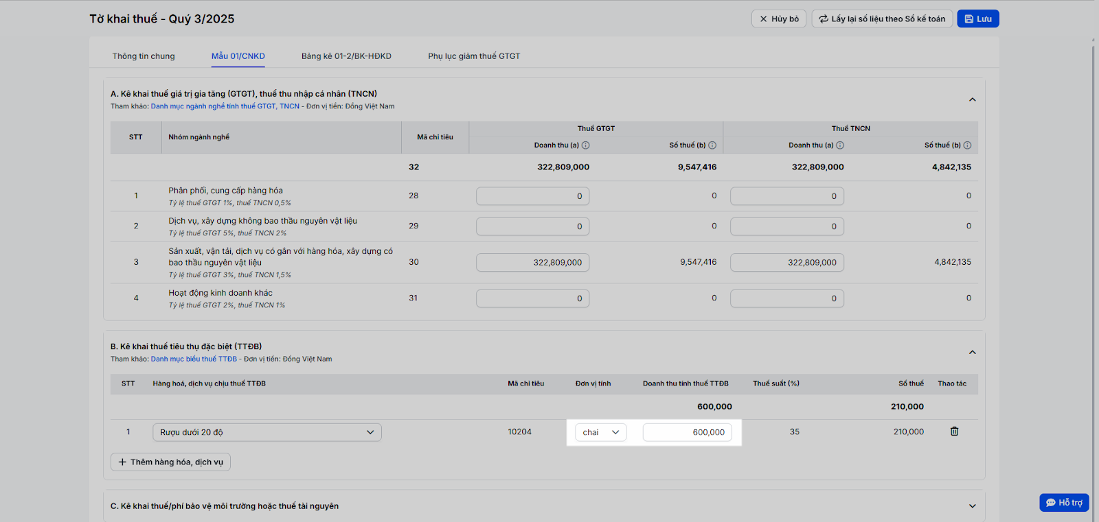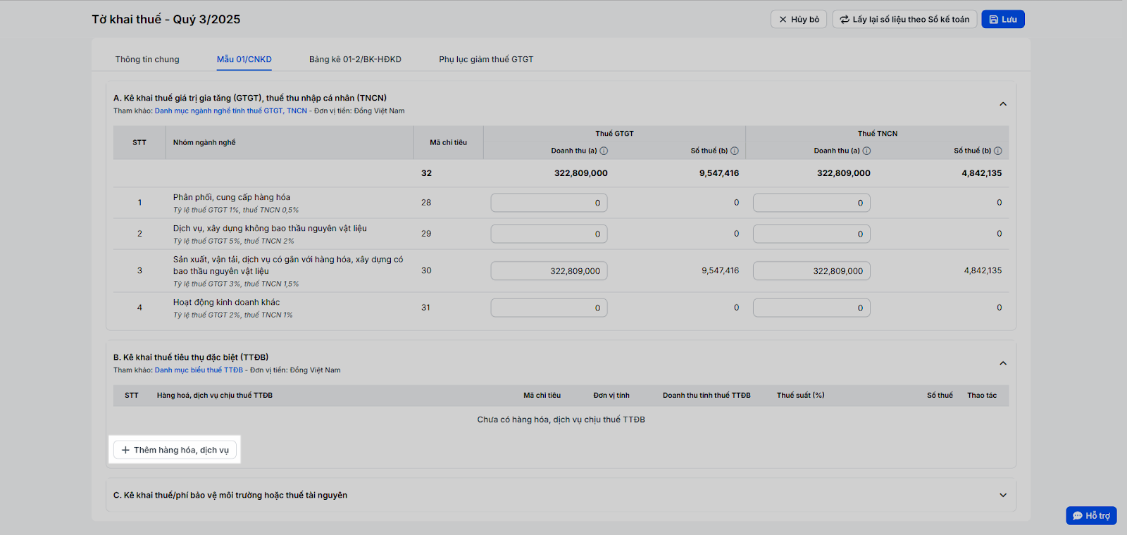 - B. Kê khai thuế tiêu thụ đặc biệt (TTĐB): Dành cho các hộ kinh doanh vũ trường, massage, karaoke hoặc các hàng hóa, dịch vụ khác chịu thuế tiêu thụ đặc biệt. Bạn cần tự kê khai doanh thu của các hàng hóa, dịch vụ chịu thuế tiêu thụ đặc biệt (hướng dẫn chi tiết mục 4. Khai báo thuế tiêu thụ đặc biệt). Nếu không kinh doanh các mặt hàng này, bạn có thể bỏ qua.