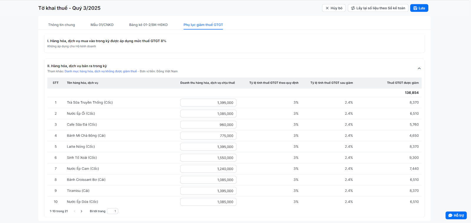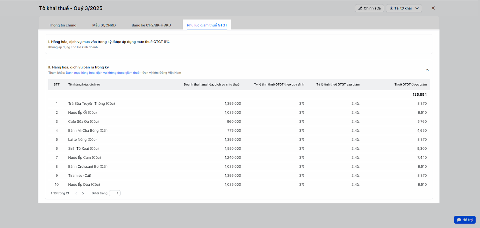 - Trong kỳ cửa hàng có giao dịch bán hàng có giảm thuế, phụ lục này sẽ tự động tổng hợp các giao dịch đó để đảm bảo bạn được hưởng đúng quyền lợi về thuế.