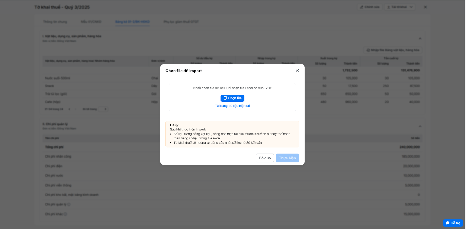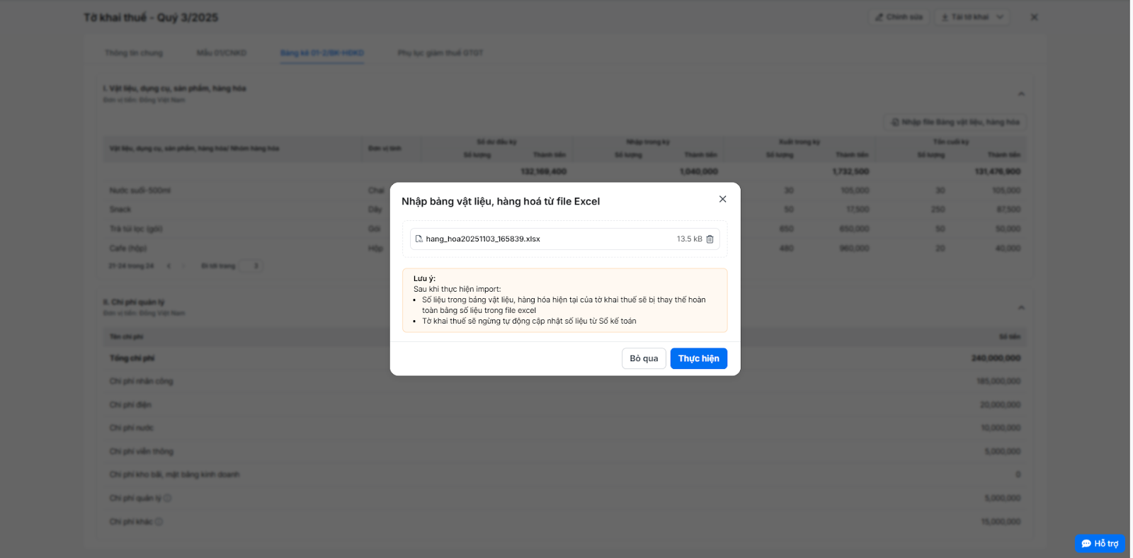 - Số liệu trong bảng vật liệu, hàng hóa hiện tại của tờ khai thuế sẽ bị thay thế hoàn toàn bằng số liệu trong file excel.