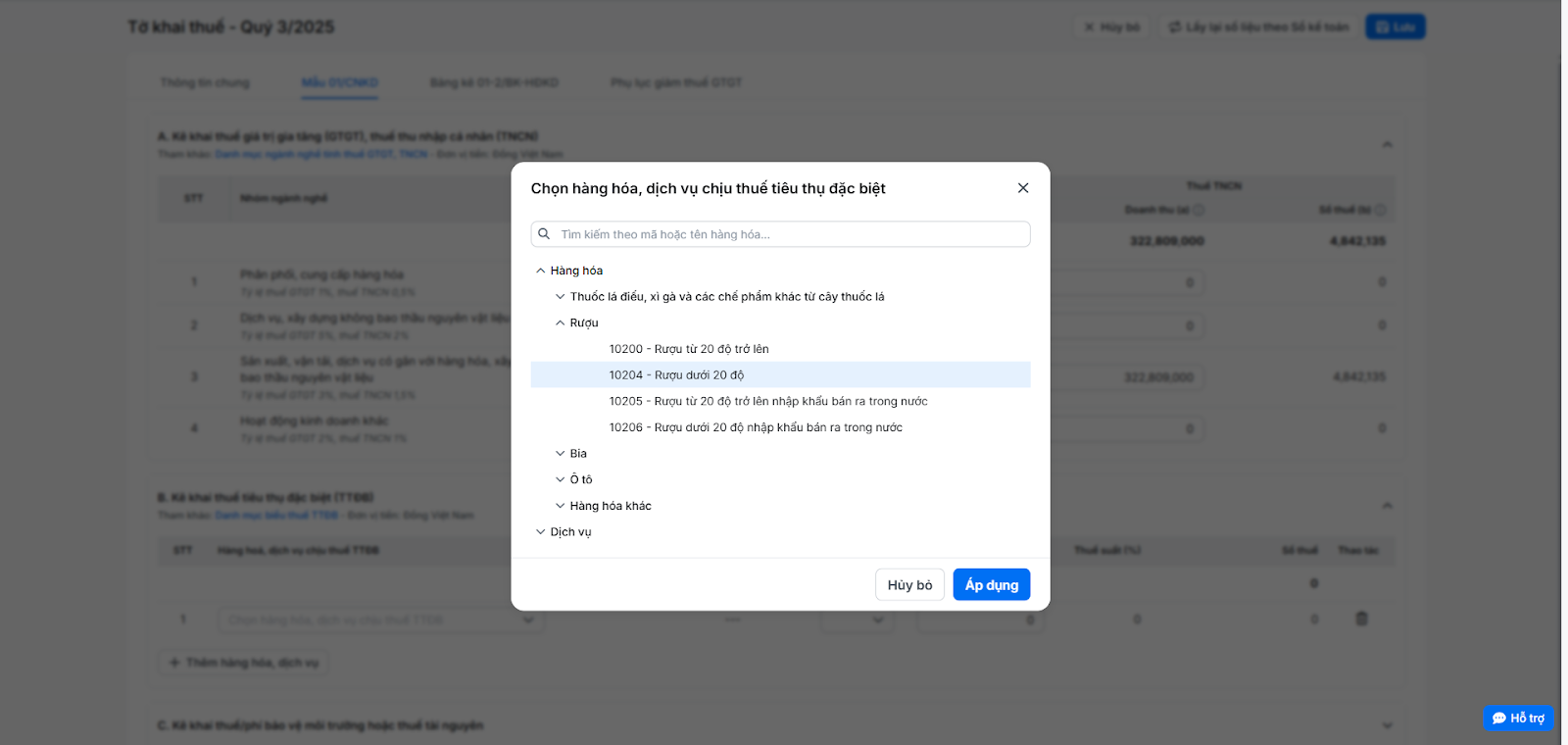 (3) Tìm và chọn hàng hóa, dịch vụ chịu thuế tiêu thụ đặc biệt theo quy định → nhấn Áp dụng.
