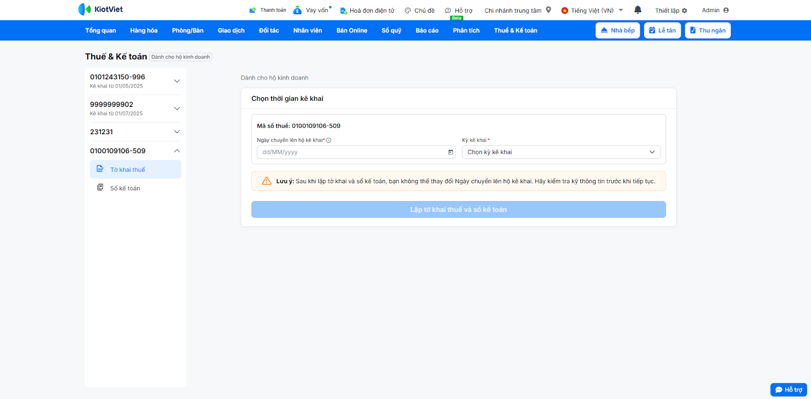 6. Lập tờ khai cho gian hàng có nhiều mã số thuế