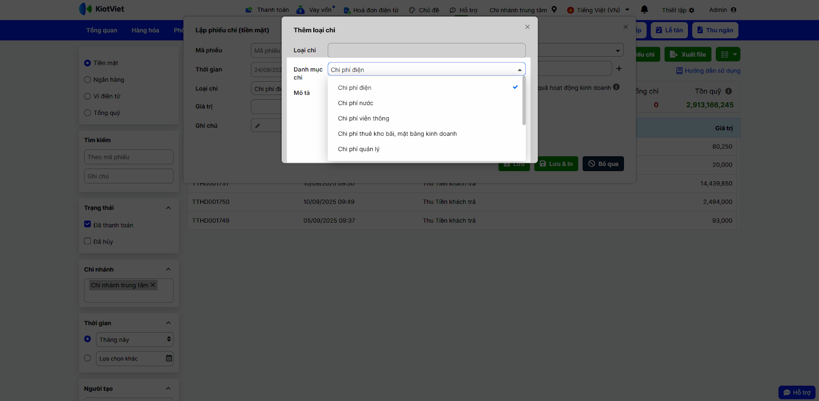 - Các chi phí khác: Dữ liệu được lấy từ các phiếu chi trong Sổ quỹ trên KiotViet, với điều kiện khi tạo phiếu chi, bạn phải chọn đúng Loại chi tương ứng (Điện, nước, viễn thông, thuê mặt bằng,…).